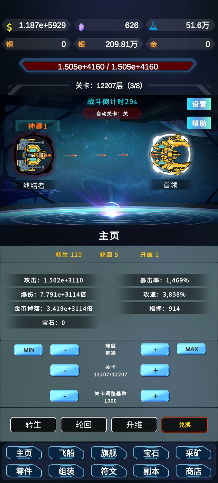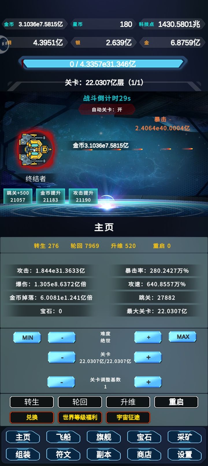 此贴只针对刚接触这款游戏的小白,对游戏有个基础的了解,少走一点弯路,大佬勿喷。首先进群948506454拿所有兑换码,对新手起步非常重要,群里也有大佬会交流游戏心得,拿完所有兑换码能得到2.2万星币,5轮回点,1纬度点,先别乱用,首先说下星币,点开下方旗舰,直接拉到最下面用1万星币激活终结者,然后升级,每级700星币,固定不变的,只升这个其他不管,星币的唯一用处,这个自带跳关+1,然后说下轮回点