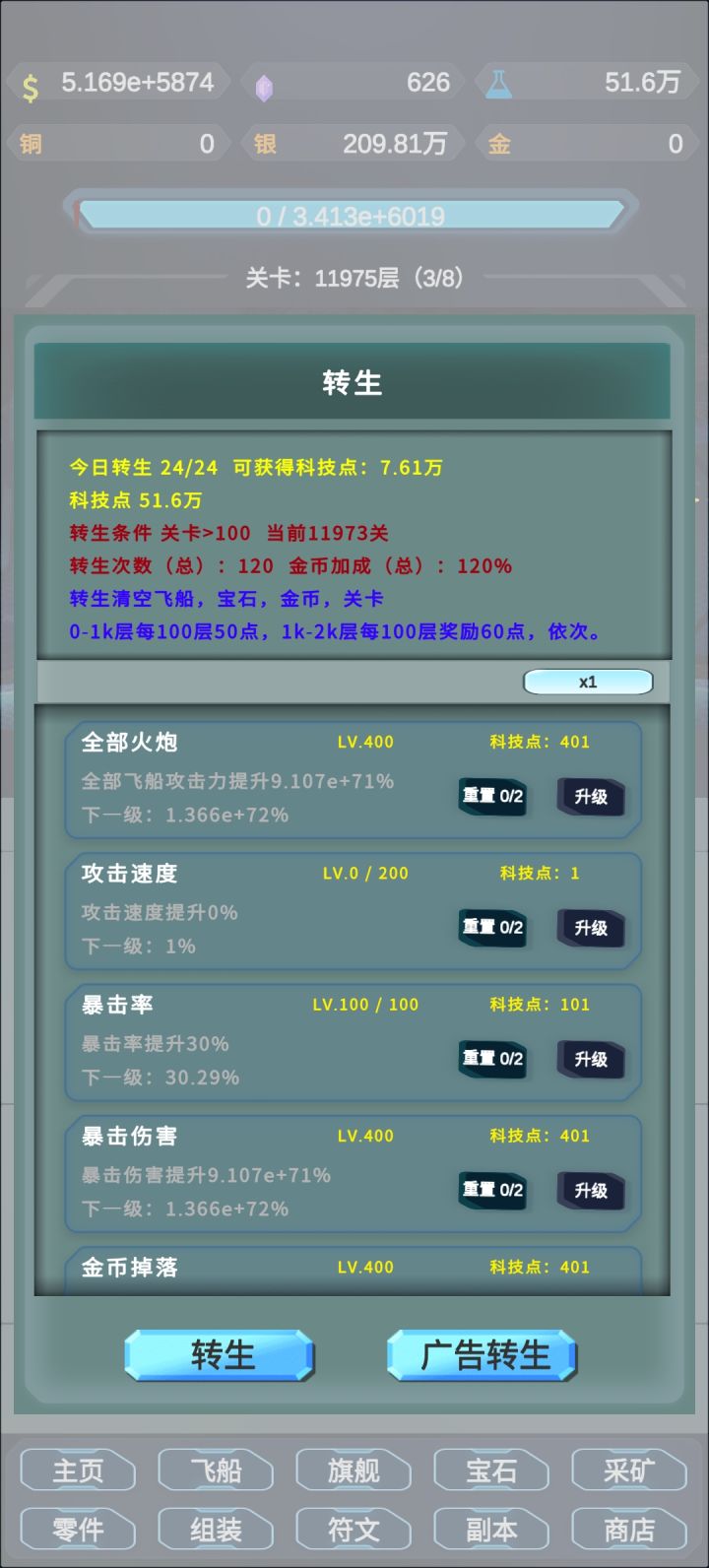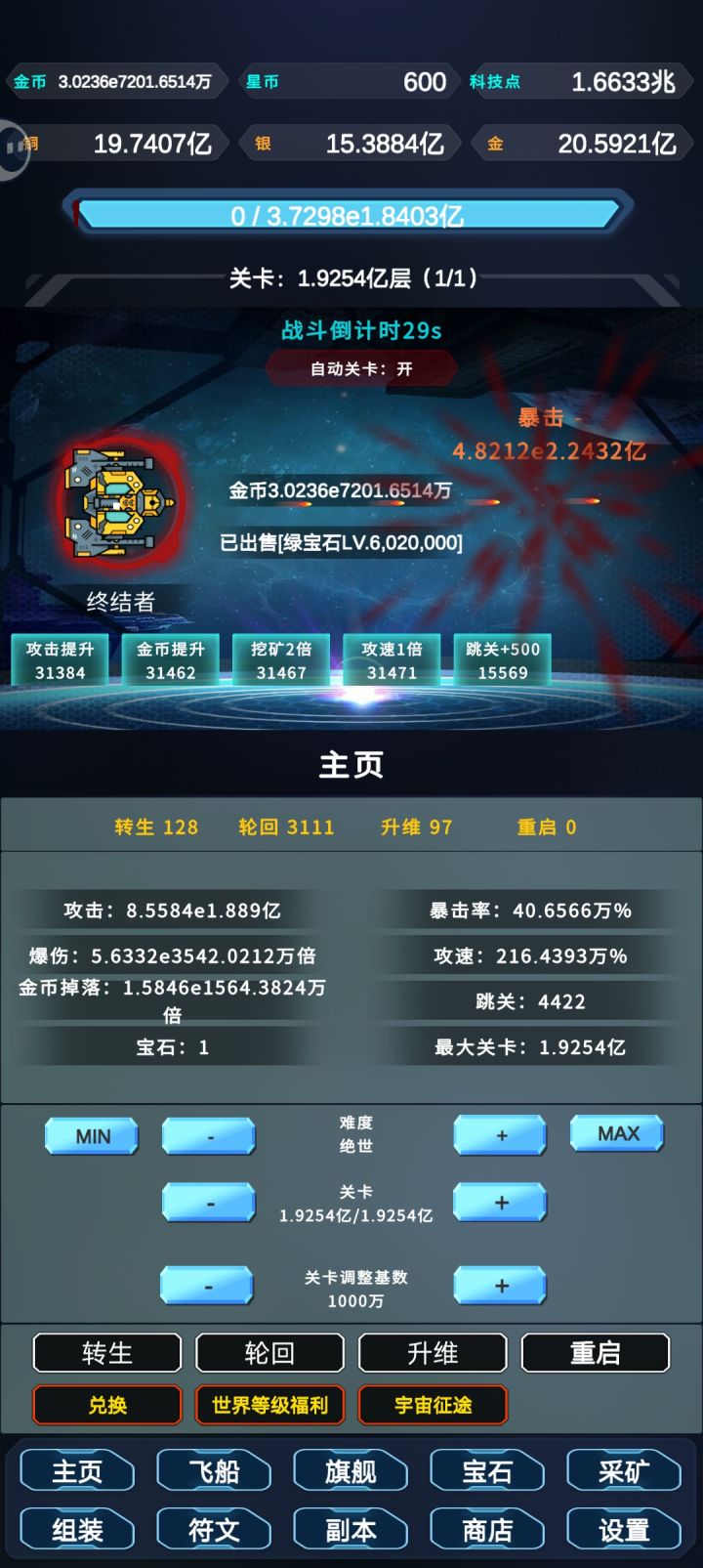 进游戏第一步,先去群里找兑换码,把所有的都换一遍,大概有几万星币,6轮回点和1升维点,升维点第一次点轮回点,这样打轮回可以每次多一轮回点,轮回科技优先的转生点加成别的低轮回时暂时不用考虑,星币用来买旗舰只买sss的就行旗舰是不叠加的只生效当前上阵的,这些搞好以后就可以开始冲关了,冲关主要是靠宝石,宝石属性是根据品质和等级决定属性,宝石等级初始为200级,转生科技里有个宝石等级上限每升一级可以增加1