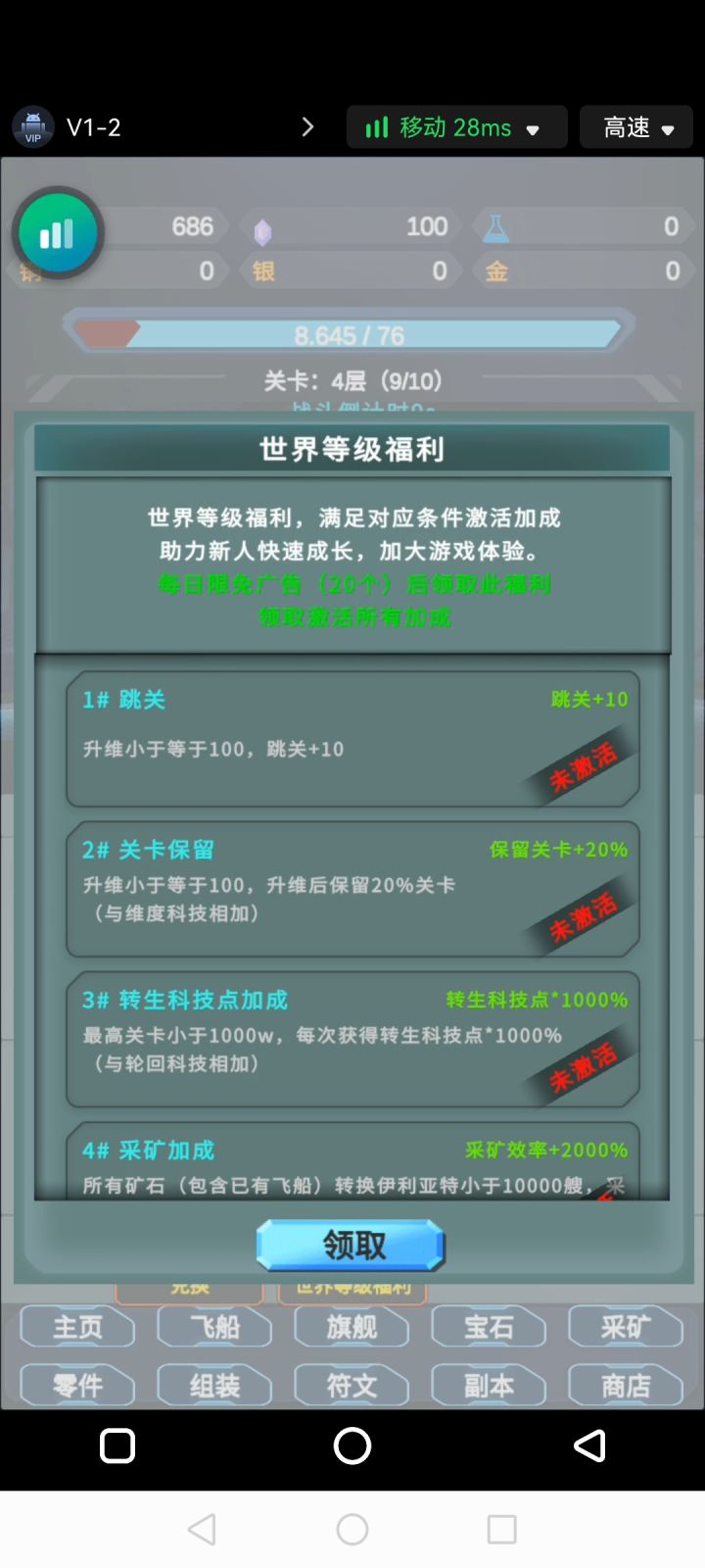 /新人攻略,新玩家进入游戏首先添加星际放置官方群,群号:948506454,加完之后先把群公告里面的兑换码,除零点重置之类,重置次数的兑换码,其余通通领取,利用领的星币,解锁sss旗舰,然后升级,可以留一千星币备用,领的升维点,在升维页面点轮回点,同时将送的轮回点,在轮回页面全点转生科技加成,有条件的话可以私聊群主搞个免广,提高开局体验,这个时候把商店里面的几个时效buff,除跳关以外看满,看满2