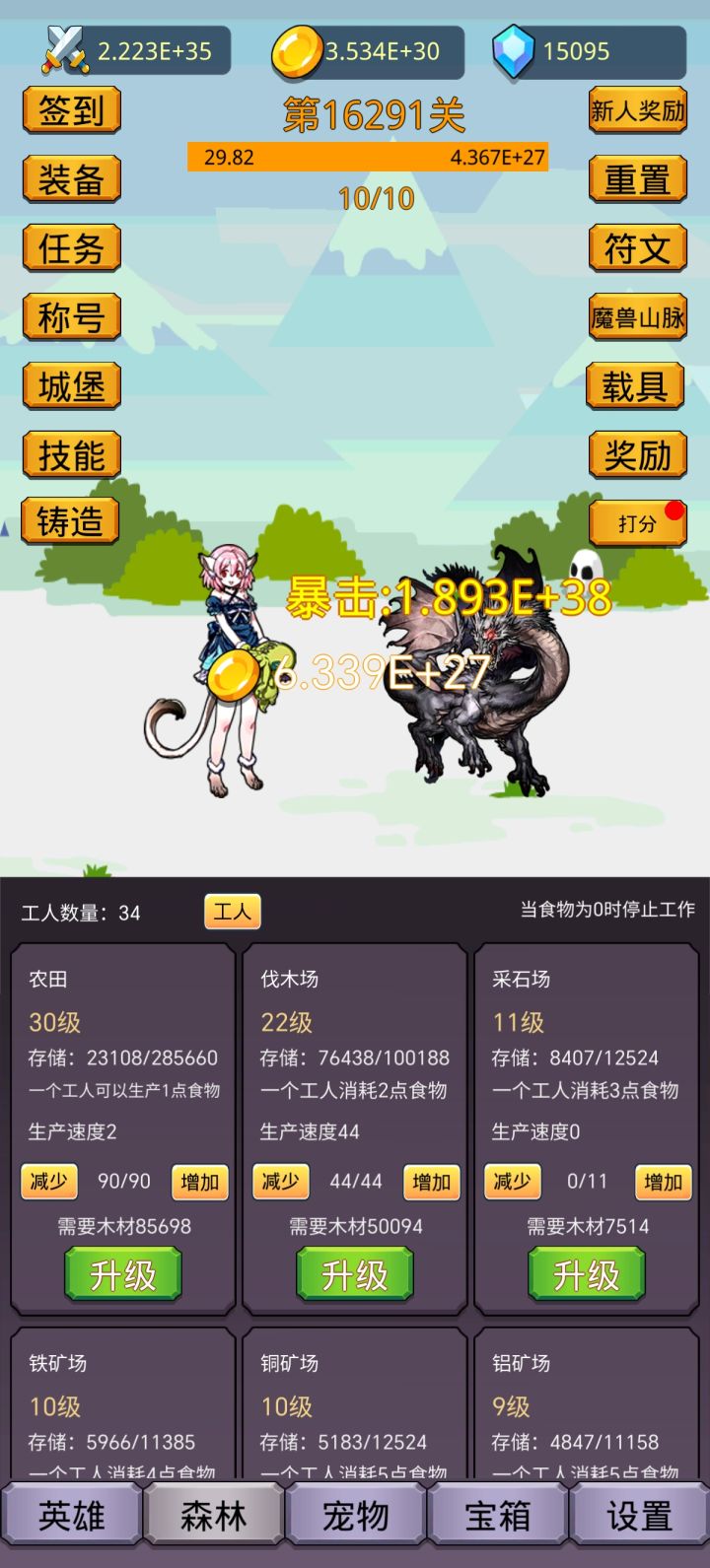 开局先别签到!也别看广告!先用兑换码cloth666,刷初始装备属性,出属性在7000%~8000%攻击,暴击值60以上,爆伤2500+以上没有就卸载重开先打关 然后重置两次,每次重置1,重置之后,用兑换码chongzhiguan,再去重置两次,获得400符文,升级符文,再看广告,看完20个高级宝箱,再去签到,每天任务奖励别忘了。森林玩法:买工人,优先升农田,然后就是伐木场,木材最大值够升级