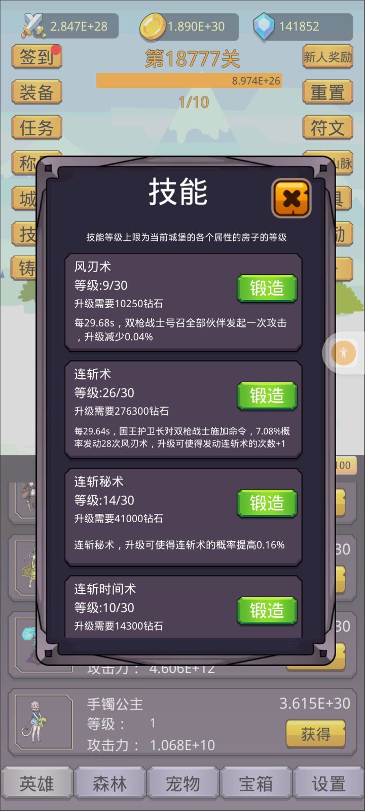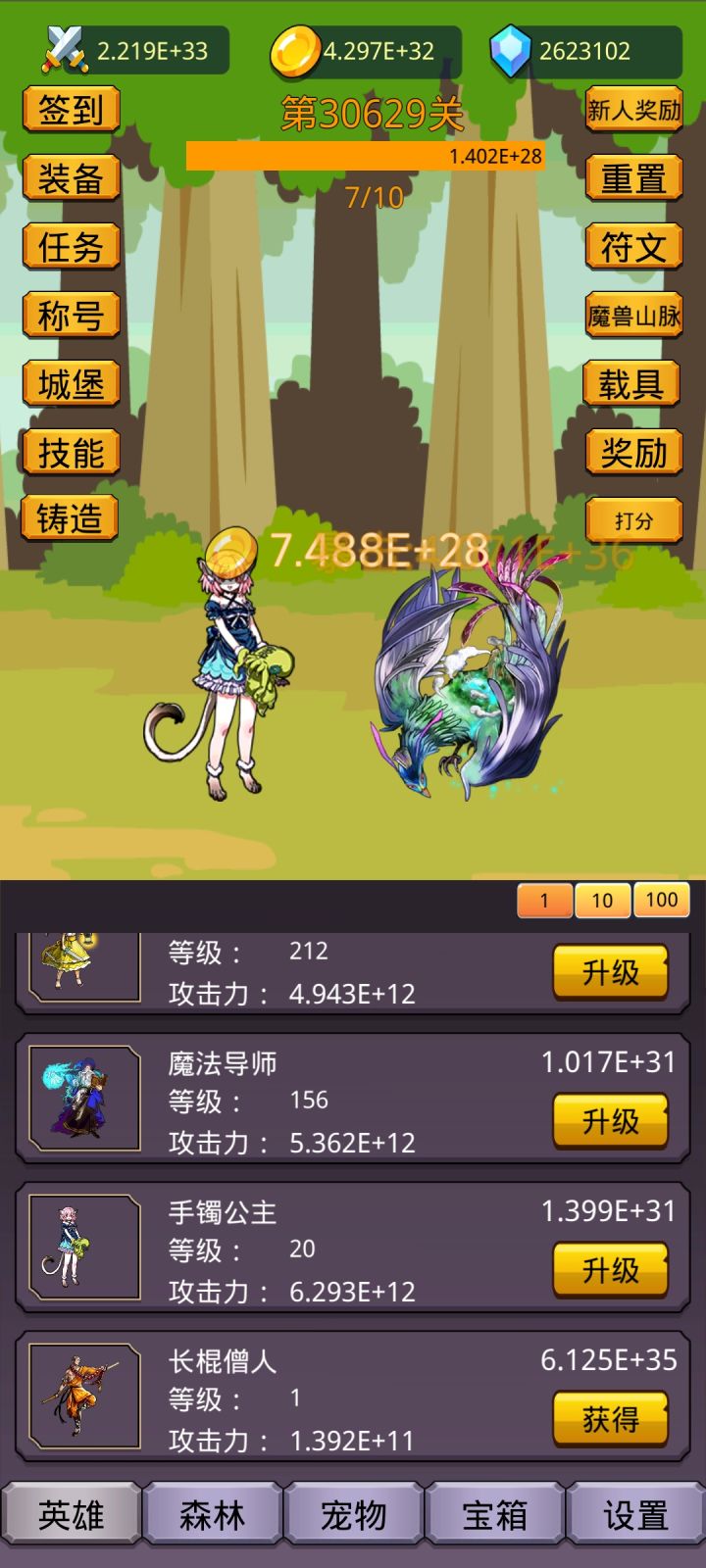 开局先别签到用兑换码cloth666,1阶稀有装备,刷出属性在7000%~8000%攻击,没有就卸载重开,其他兑换码chenghao666,chenghao888,chenghao888888得称号值,推到25关重置两次,每次重置1关,然后用兑换码chongzhiguan,再去重置两次,获得400符文,升级符文,再看广告,看完20个高级宝箱,再去签到,每天任务奖励别忘了。森林玩法:买工人,优先升