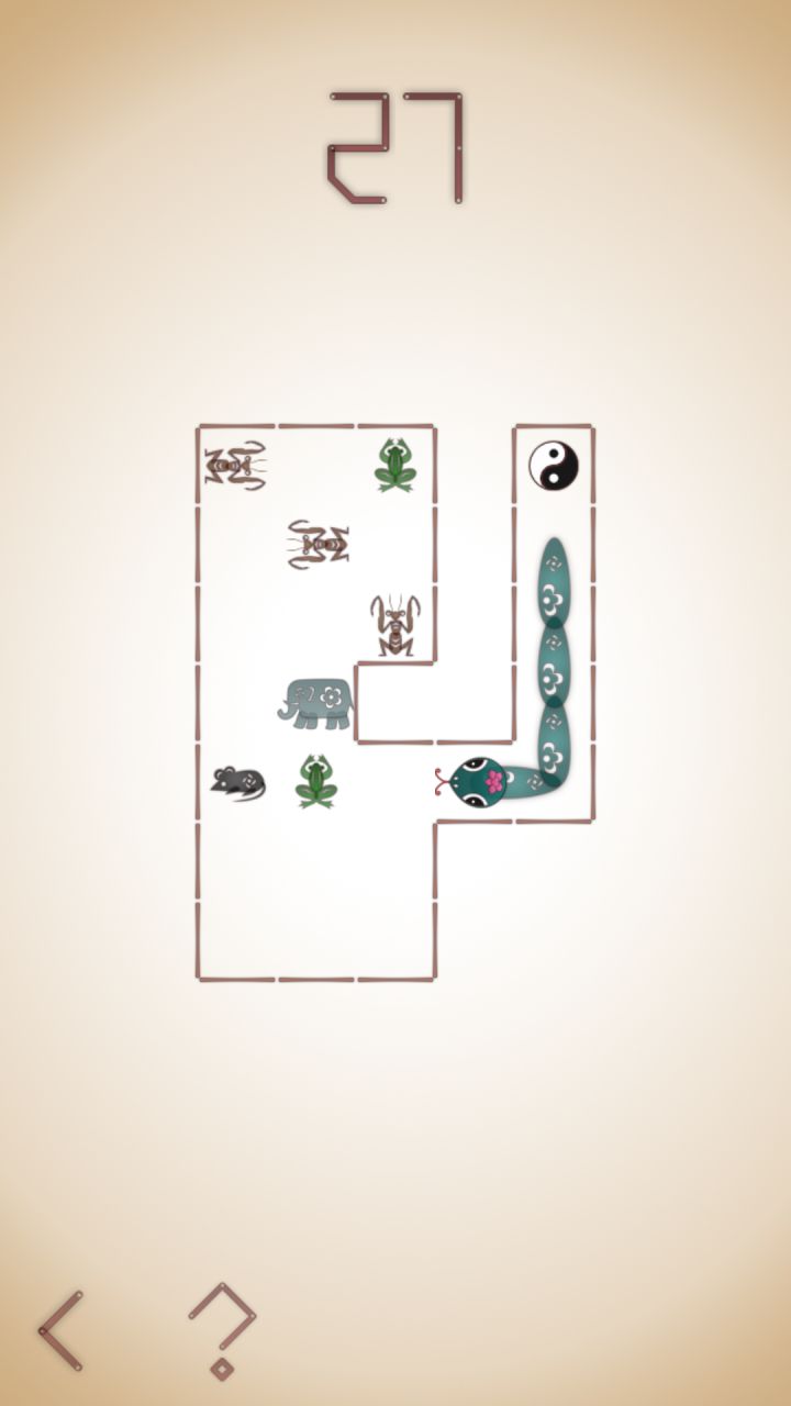 玩了五个多小时才通关,比较心累。说说心得:其实我感觉这块游戏就是益智趣味版的数学题,先给你已知条件鼠青蛙蛇大象乌龟,用推箱子贪吃蛇的模式,来让你求出如何让蛇在有限的格子里将其他动物吃掉并回到回到太极中去。同时隐含条件就是青蛙能让蛇头尾倒置,大象能让蛇重若千钧,只能伸长而不能移动,乌龟就是定时炸弹,在蛇尾成为压死蛇儿的最后一根稻草,螳螂就是一把只能朝向前方的菜刀,刀尖寸草不生,刀背不堪一击。所以