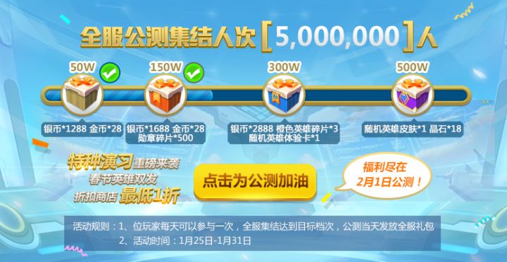 亲爱的玩家们:非常感谢大家对我们的支持和厚爱,删档测试服"守望战场"已于7月31日24点正式结束,目前删档测试服务器已关闭,玩家暂时无法登陆游戏。同时《小小突击队》将于8月4日早上9点正式全网首发,更有重磅首发福利:登陆送热门英雄皮肤、注册得好礼等你来领!再次感谢各位taper友对《小小突击队》的大力支持!8月4日首发【十大福利活动】活动一:全英雄限时折扣出售活动时间:8.4~8.10