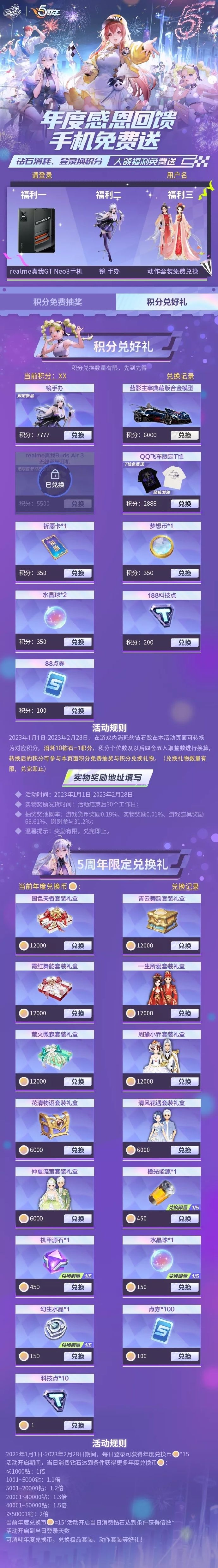 ⭐2023年1月1日-2月28日,游戏内消耗钻石即可获取积分,参与抽奖将有机会获得realme真我手机,使用积分还可兑换镜手办、蓝影主宰典模型等珍贵福利! ⭐活动期间,每日登录游戏还能获得“年度兑换币”,使用年度兑换币即可兑换动作套装、游戏道具等丰富好礼哦~