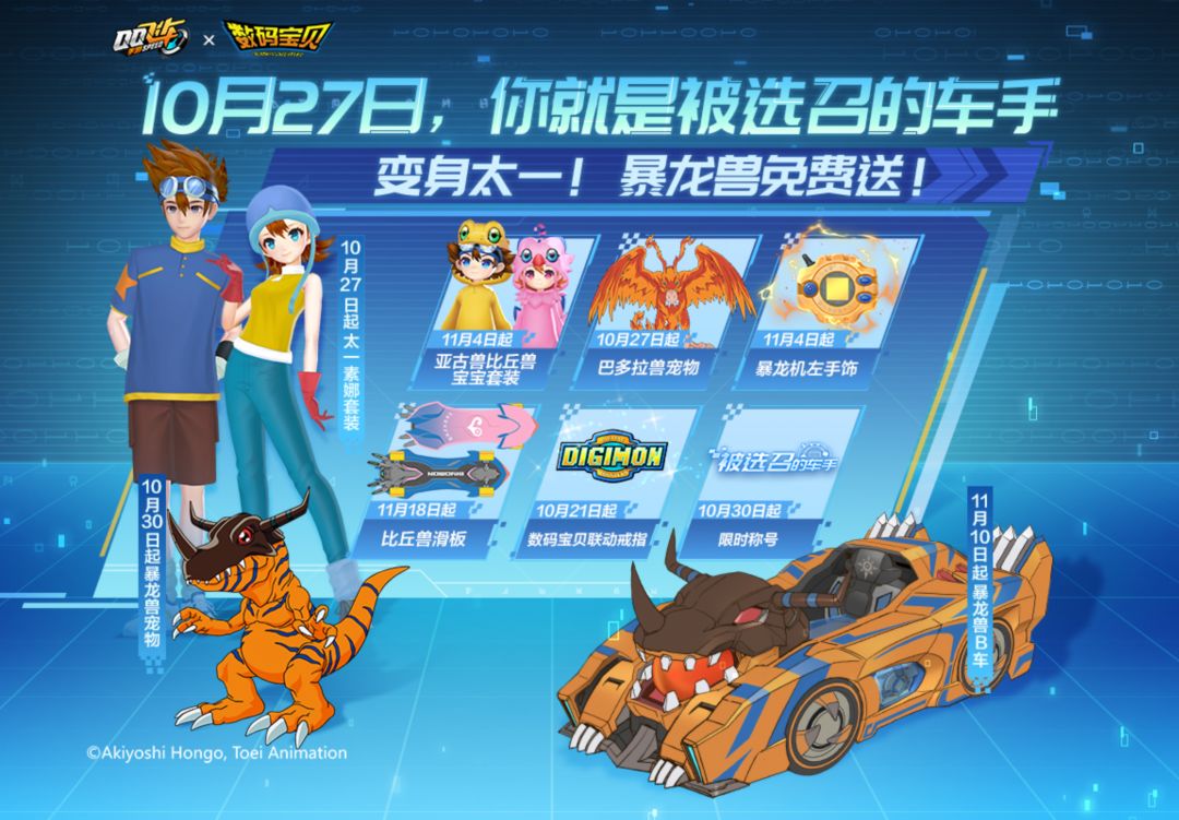 “下面插播一条消息,受到时空乱流的影响,数码世界和飞车世界发生混乱,恶魔兽即将入侵飞车大陆!请广大车手们注意,寻找并帮助数码宝贝,一起拯救飞车大陆!”正沉浸跑图的小橘子被突然弹出的消息吓了一跳,急忙四处找寻相关线索,但却一无所获,似乎只有小橘子收到了这样的消息。小橘子内心os:难道我是被选召的车手吗?可是该怎么寻找数码宝贝呢?此时,一张海报引起了小橘子的注意。 变身主角团 太一素娜套装免费得! 即