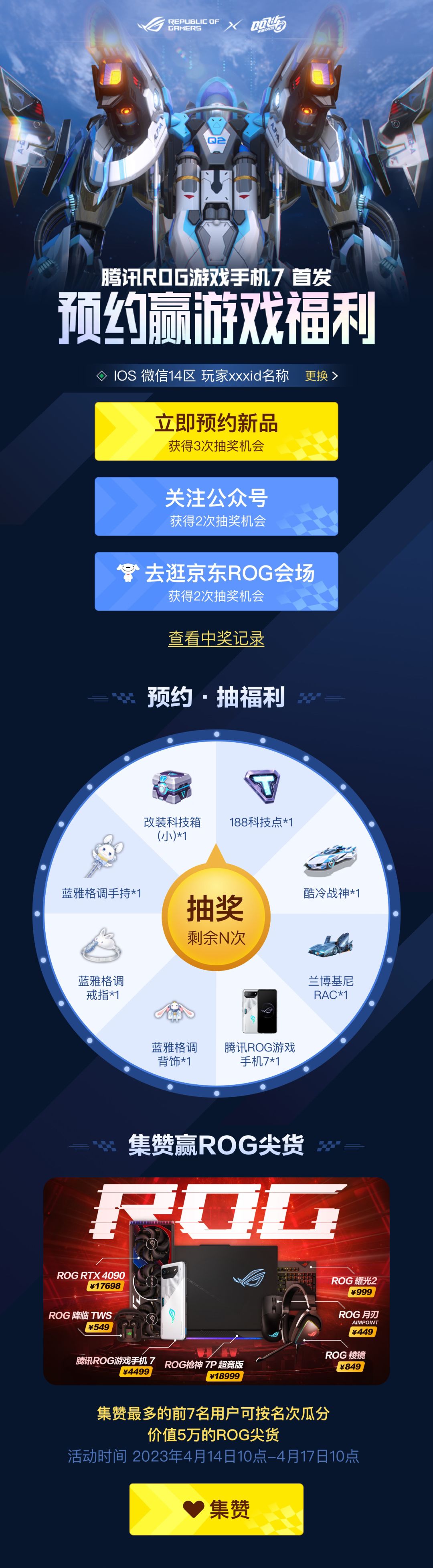 奖品:ROG7新品手机、ROG RTX 4090、ROG枪神7P超竞版等ROG豪礼 参与方式:进入QQ飞车手游,腾讯ROG游戏手机7首发专属福利页面,下滑找到【集赞赢ROG尖货】,按页面提示参与活动 完成活动页面的任务,赢更多抽奖机会,更多好礼哦!点击参与 ROG全家桶在招手,你心动了吗?赶快来一把游戏!#ROG游戏手机#有奖活动#福利#游戏福利#福利活动