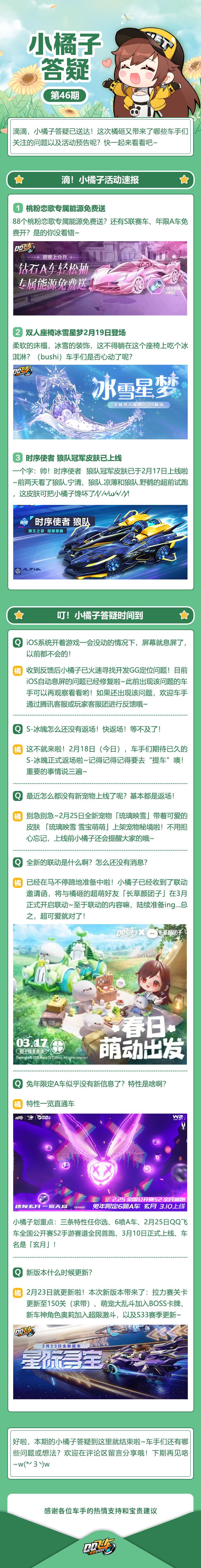 ⭐桃粉恋歌专属能源免费送,双人座椅冰雪星梦、时序使者 狼队冠军皮肤重磅上线~ ⭐橘妹也对iOS自动息屏、全新宠物、全新联动及兔年限定A车等相关问题进行了解答~ 全新版本-星际寻宝将在2月23日上线,超多玩法升级,精彩不容错 过~