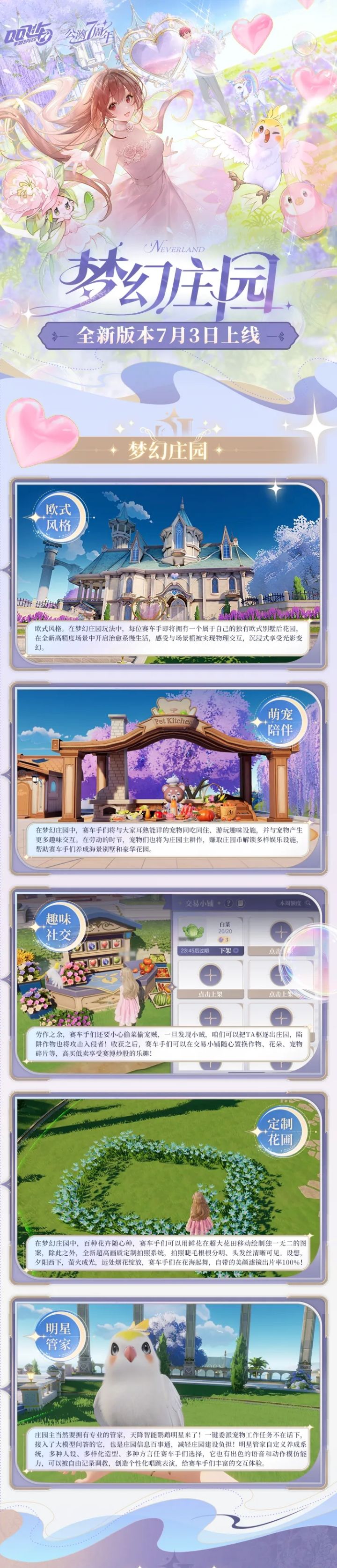 全新沉浸式萌宠相伴家园玩法「梦幻庄园」将于7月3日上线,本次更新后车手们不但能和宠物们一起播种,感受“赛博种田”的乐趣~还有淘汰赛升级版玩法——极速锦标赛全新来袭!当然,T车蓝波豚宝、A车鹦明神鹉等公测7周年福利,以及全新臻藏系列定制套装等也在等着车手们带走哦~快跟上小橘子的步伐,看看这次都有哪些新内容吧!以上就是小橘子带来的新版本内容啦!车手们最期待哪个活动呢?快来下方评论区和小橘子分享,7