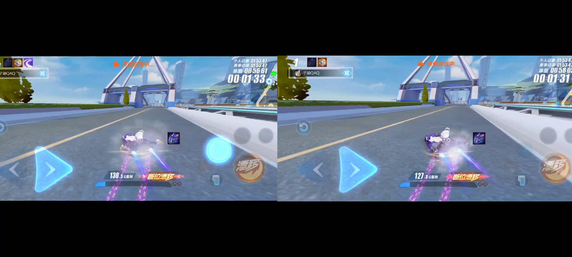 左边有宠,右边无宠。右边开局第一个u弯漂移角度小了,虽然速度稍快但是集气不够,卡了下气就慢了点,左边在ecu那蹭了墙,就当抵消了部分差距,不过我也做不到两边过弯速度一模一样,大体一致已经尽力了。