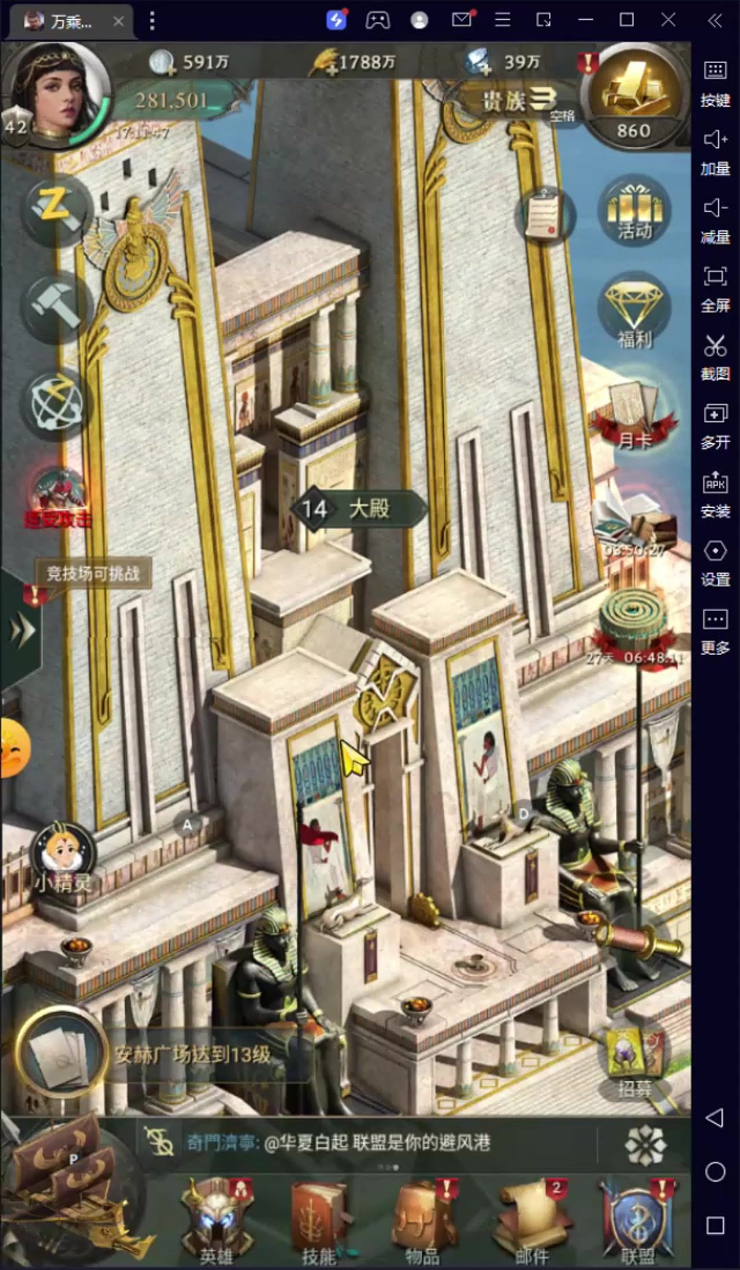 首先说说这游戏的文明吧,开局就可以选择自己喜欢的文明,有华夏丶法老丶爱情海三个文明,选择不同的文明里面的建筑也不一样,给人的视觉体验拉满,建筑都符合文明的特征,我就喜欢法老文明,他的文明特点就是多段攻击减防,就是我比较喜欢这个文明的原因。再次点赞画风,棒棒哒。