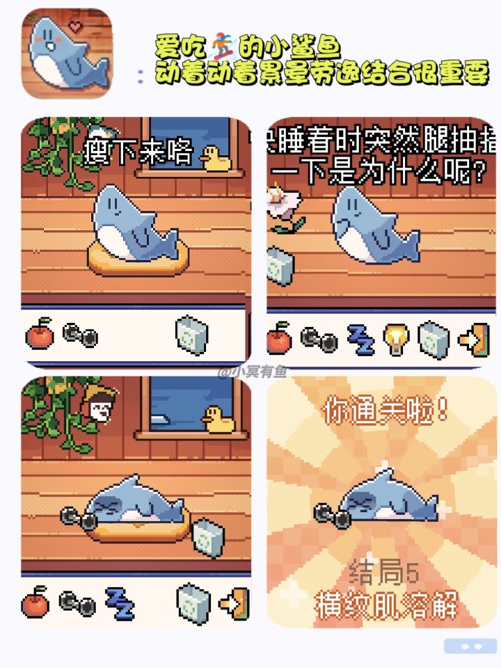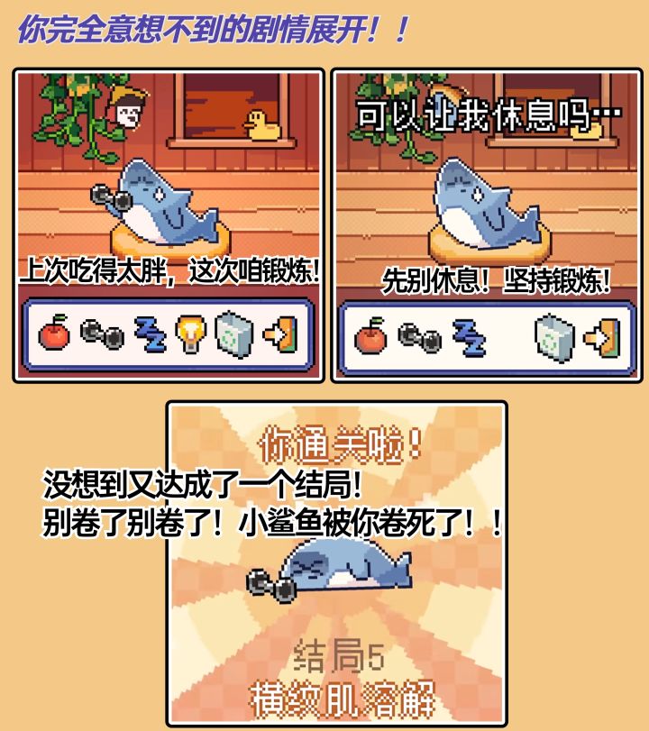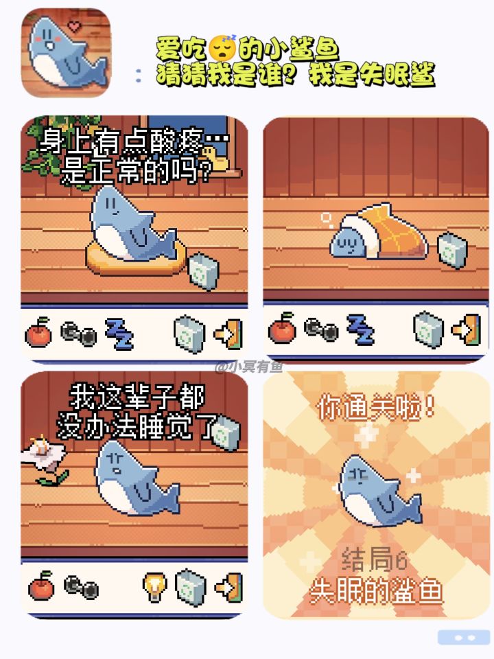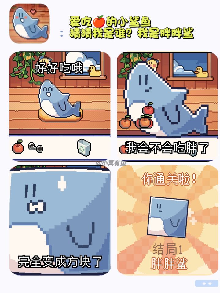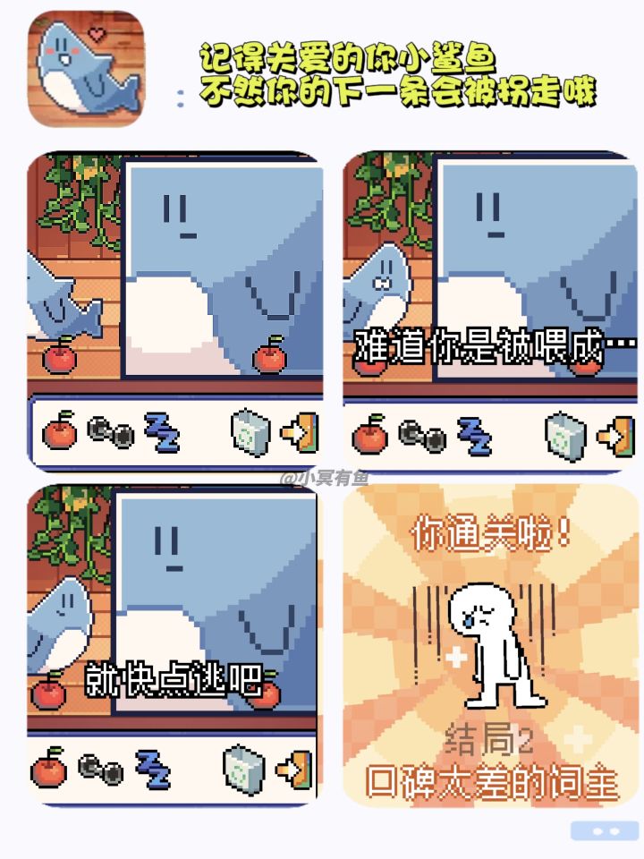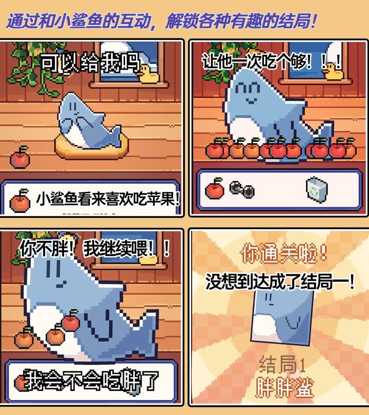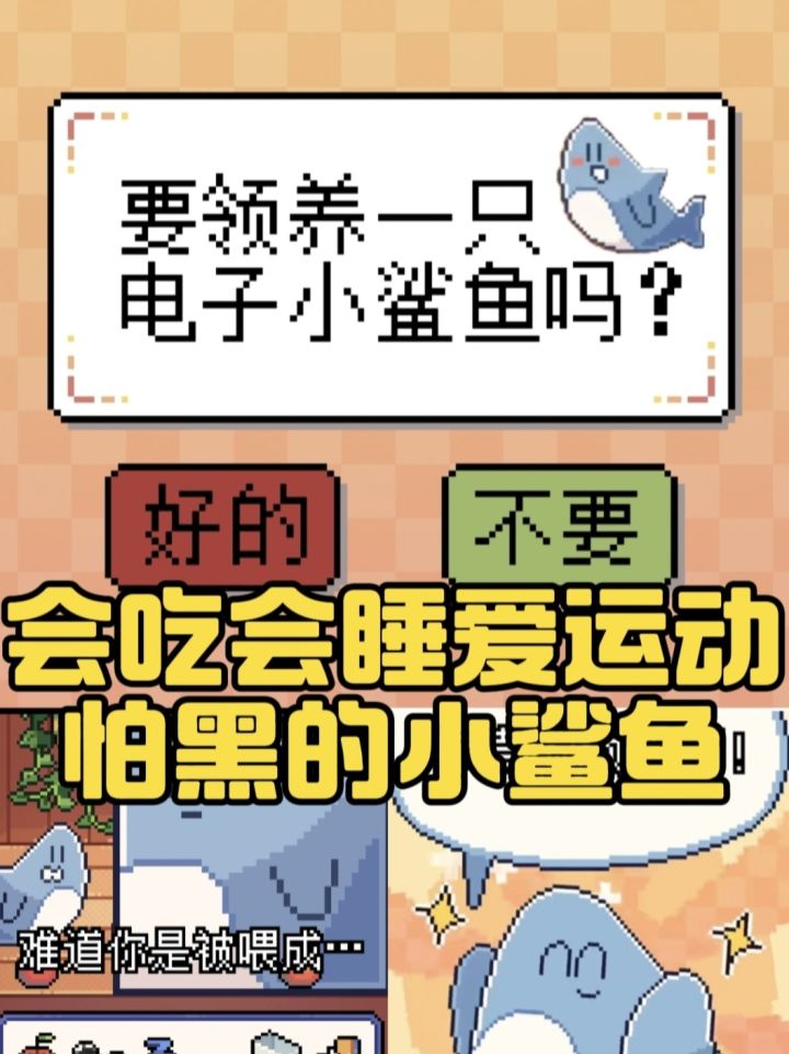 ✨来领养一只电子小鲨鱼吧!这么可爱的小鲨鱼你难道你想要嘛❓啊🔥真的不想要嘛❓✨给它喂食、让它锻炼、看它睡觉,这一切看起来就像治愈快乐的宠物养成游戏一样。🍎“好好吃哦,呕,真的好好吃哦,呕”😴“让我睡一会儿zzz,不想睡了zzz,咦我的睡觉功能去哪了zzz?”✨尽管小鲨鱼是弱小的,面对一切都是无能为力的。尽管它们可以一直吃的很胖,很胖变成正方形。然后来拐走你这次的小鲨鱼。小鲨鱼能有什么坏心思