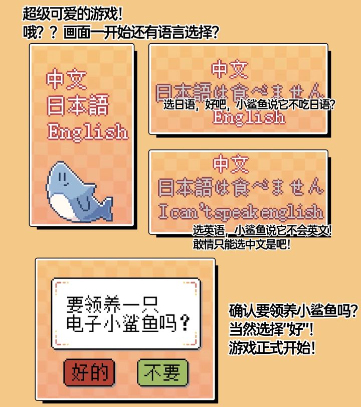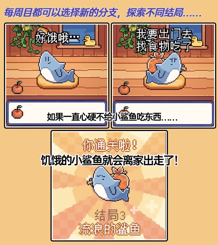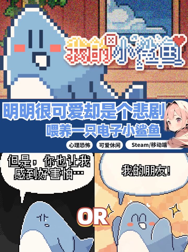 来自B站Up主Warma制作的一款免费游戏!玩法上来说像素风格的超级可爱电子宠物喂养游戏,但当你体验,就会发现它可不简单!!!通过选择不同的道路,可以和小鲨鱼进行很多有意思的互动,小鲨鱼的配音实在是太可爱啦!可以喂它吃苹果,也可以督促它举铁锻炼…但是游戏的设计也非常让人意外,你可以满足小鲨鱼的愿望,和它成为好朋友,甚至也可以恶趣味地恶意捉弄它!这个游戏竟然还有一些暗黑克系元素!Warma分