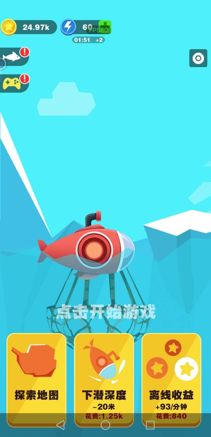 可升级的内容仅有下潜深度和离线收益两项,玩法也是在重复下潜中循环,养成深度堪比超休闲类游戏,而且数值被放大,整体结构也是小游戏那种,纯靠等收益来支撑游戏内容。