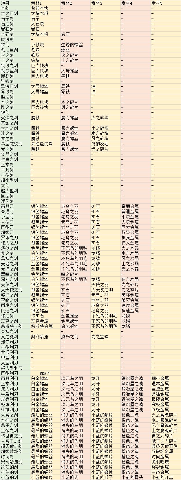 【转载请注明出处】最近沉迷这游戏,找配方时发现目前网上的配方汇总基本都不完善,想着反正也收集了就顺便码出来了。带下划线的是需要合成的材料,为了方便搜索,标了号。【有部分手机看圈圈二十以上的带圈数字,只能显示数字,带来不便请见谅】【装备】木剑(力+5):普通木块木之巨剑(力+10):大块木料石子剑(力+10):石子石之剑(力+15):大石块岩石剑(力+20):岩石木石剑(力+35