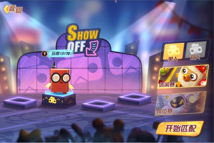 玩家可以通过系统匹配来与其他玩家一起进行游戏。匹配赛包括休闲赛和排位赛2种模式。休闲赛:比赛结果不会影响玩家的排位积分与段位,玩家可以更放松地与其他玩家进行竞技游戏。排位赛:比赛结果将会影响玩家的排位积分与段位,是玩家一展实力的平台。单人匹配情况下,游戏会是4位单人玩家进行1V1V1V1的乱斗模式。无所顾虑,尽情开撕吧~开始匹配前,不要忘了通过角色界面切换一个自己喜欢的角色哦~
