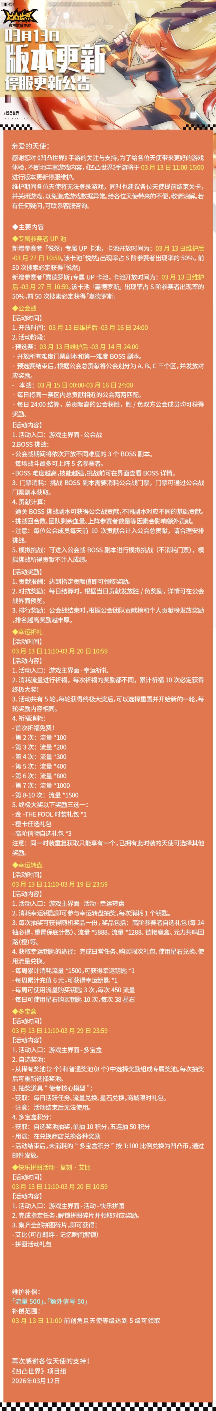 亲爱的天使:感谢您对《凹凸世界》手游的关注与支持。为了给各位天使带来更好的游戏体验,不断地丰富游戏内容,《凹凸世界》手游将于3月13日11:00-15:00进行停服维护。维护期间各位天使将无法登录游戏,同时也建议各位天使提前结束关卡,并关闭游戏,以免造成游戏数据异常。给各位天使带来的的不便,敬请谅解。若有任何疑问,可联系客服咨询。如遇问题可加入官方QQ交流3群(538504762)携带截图联