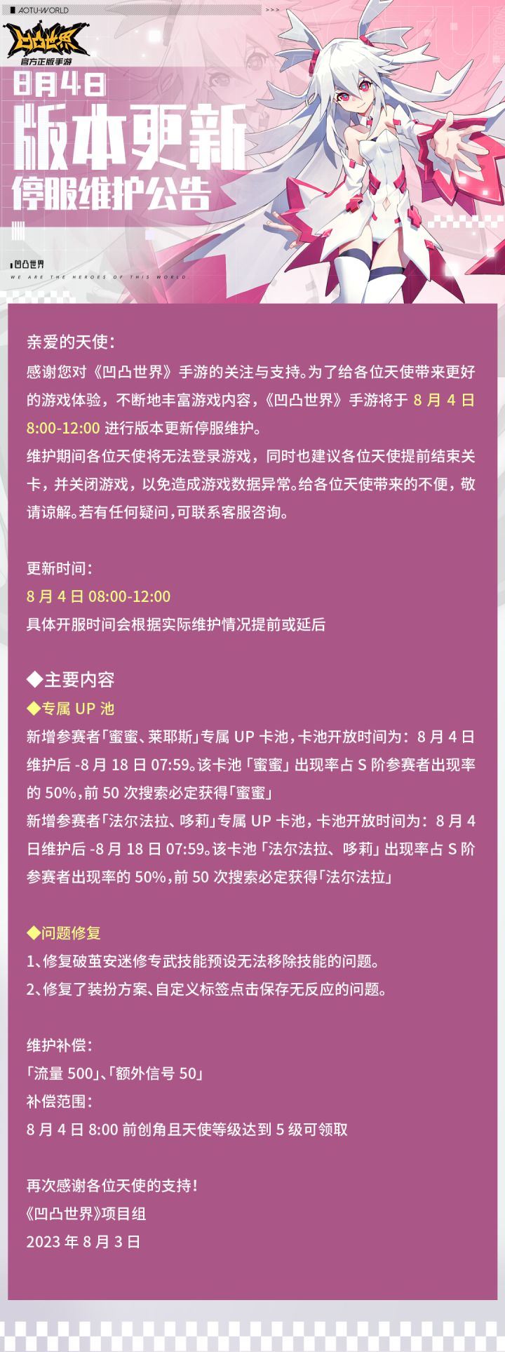 亲爱的天使:感谢您对《凹凸世界》手游的关注与支持。为了给各位天使带来更好的游戏体验,不断地丰富游戏内容,《凹凸世界》手游将于8月4日8:00-12:00进行版本更新停服维护。维护期间各位天使将无法登录游戏,同时也建议各位天使提前结束关卡,并关闭游戏,以免造成游戏数据异常。给各位天使带来的的不便,敬请谅解。#凹凸世界手游