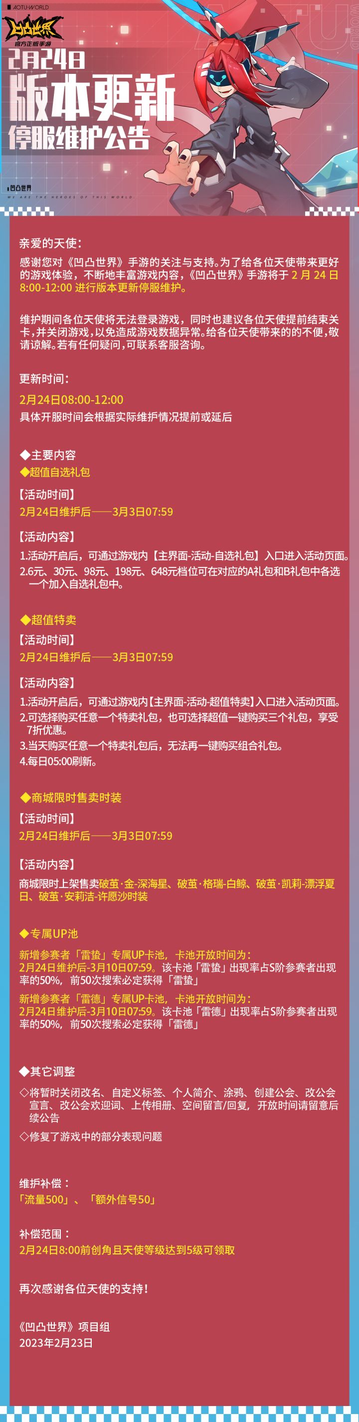 亲爱的天使:感谢您对《凹凸世界》手游的关注与支持。为了给各位天使带来更好的游戏体验,不断地丰富游戏内容,《凹凸世界》手游将于2月24日8:00-12:00进行版本更新停服维护。维护期间各位天使将无法登录游戏,同时也建议各位天使提前结束关卡,并关闭游戏,以免造成游戏数据异常。给各位天使带来的的不便,敬请谅解。若有任何疑问,可联系客服咨询。
