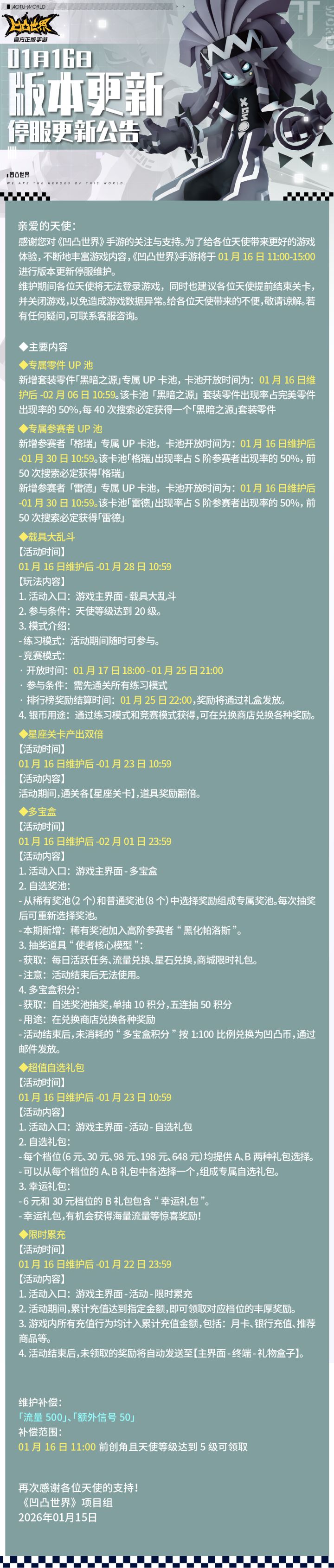 亲爱的天使:感谢您对《凹凸世界》手游的关注与支持。为了给各位天使带来更好的游戏体验,不断地丰富游戏内容,《凹凸世界》手游将于1月16日11:00-15:00进行停服维护。维护期间各位天使将无法登录游戏,同时也建议各位天使提前结束关卡,并关闭游戏,以免造成游戏数据异常。给各位天使带来的的不便,敬请谅解。若有任何疑问,可联系客服咨询。如遇问题可加入官方QQ交流3群(538504762)携带截图联系