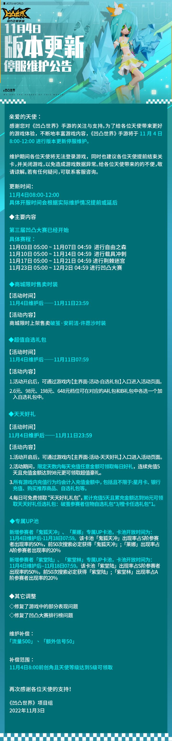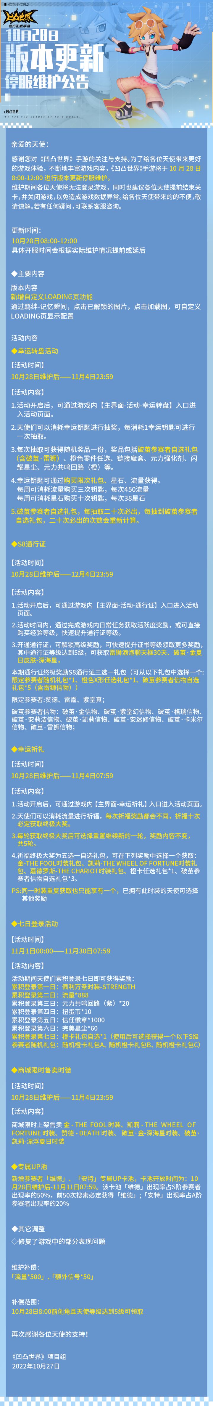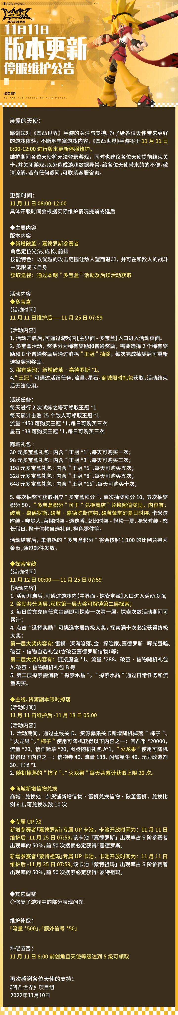感谢您对《凹凸世界》手游的关注与支持。为了给各位天使带来更好的游戏体验,不断地丰富游戏内容,《凹凸世界》手游将于11月4日8:00-12:00进行版本更新停服维护。