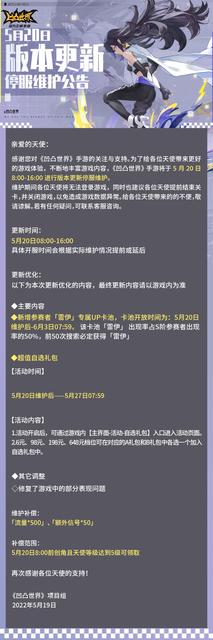 亲爱的天使,非常抱歉地通知大家服务器维护预计再次延迟至19:30结束,我们将会为天使发放维护补偿【流量*500,小甜甜粽子*10、小咸咸粽子*5,信号*50 】,请天使维护结束后进入游戏进行领取,对于此次临时维护带来的不便,我们十分抱歉,感谢天使的理解和支持!