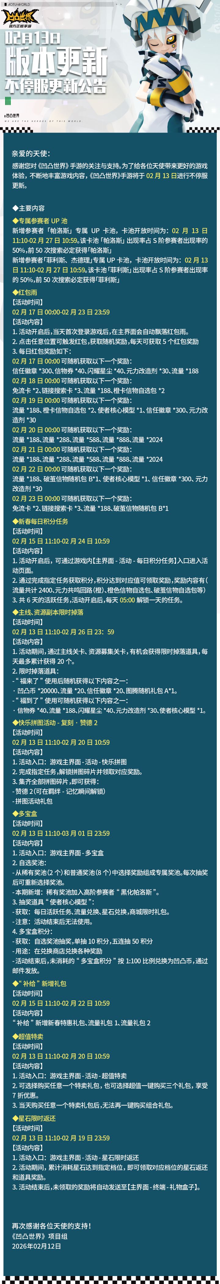 亲爱的天使:感谢您对《凹凸世界》手游的关注与支持。为了给各位天使带来更好的游戏体验,不断地丰富游戏内容,《凹凸世界》手游将于2月13日进行版本不停服更新。若有任何疑问,可联系客服咨询。如遇问题可加入官方QQ交流3群(538504762)携带截图联系群内裁判球处理。官方客服QQ:3008053924。#凹凸世界 #凹凸世界手游 #发现好游戏