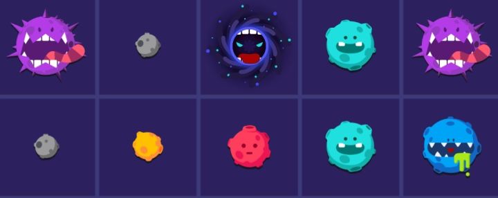 第二行左到右,(注意不论多个合成,没有多加分,比如4个黄,就是8分,5个蓝就是25分)(所以黑洞尽量三个合)灰1分,合成3个3分黄2分,合成3个6分红3分,合成3个9分青4分,合成3个12分蓝5分,……紫6分,……黑洞7分,……,合成后给一个陨石,清除一行(只能横着)清除是给分的钻石可以买道具用:①清除单格,②刷新手牌(好像是只会变单格),初始20钻,每用一次+10钻