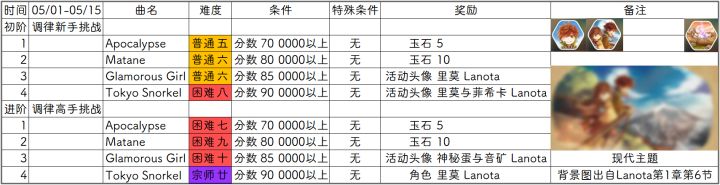 五一假期来了~跟着假期同步到来的还有新一期的限时~本期限时是Lanota的复刻~之前没玩到的诗人们可以趁此机会拿到限定角色哦~什么?还有新头像?你永远猜不到官方还有多少东西没放出.jpg希望大家都能享受这次限时~