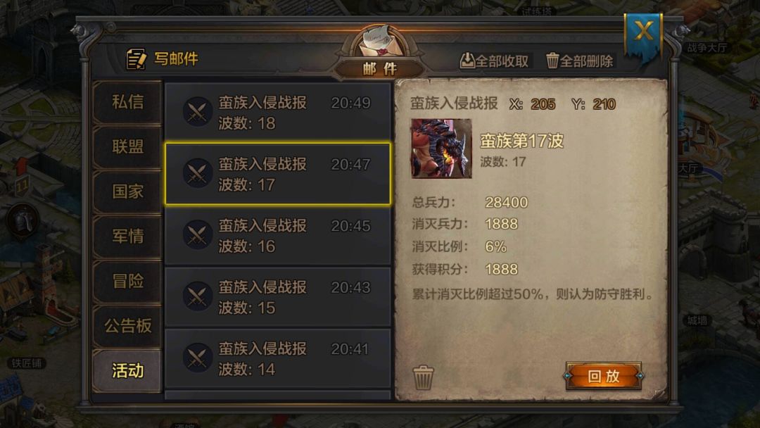 王朝之初,少不了各地征伐,一方面是为了以战养兵,增强部队的作战能力;而另一方面则是为了弘扬国家的威严,让自己的名声传遍大江南北。但是,在各位领主忙于征战时,蛮族人的目光却悄然投向了我们的国家,他们的野心熊熊燃烧,各位领主,快快调遣部队,守卫王朝,抵御蛮族入侵! 蛮族入侵是一个联盟活动,这个活动在周三的晚上拉开序幕,由盟主开启。全联盟的各位领主都可以参加,击退来犯的蛮族部队,保护自己的国家,守卫国家