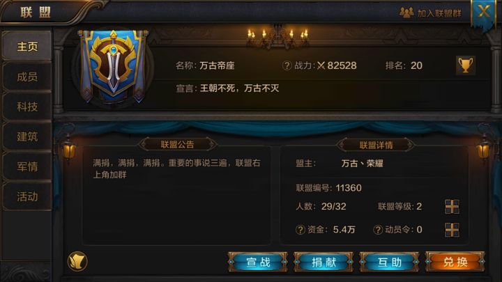 《我的王朝》是一款国战类的游戏,由于国战类游戏的特殊性,所以在王朝世界里,联盟玩法是一个很重要的版块,那么联盟玩法的各个功能又是如何操作呢,今天就让各位领主们跟着笔者的步伐,让我们慢慢来解读解读。游戏之初,当各位领主们加入到自己喜欢的联盟后,就会开放联盟系统玩法,各位领主们可以在联盟里面找到志同道合的小伙伴,可以在联盟里成员之间互帮互助,可以在联盟里兑换各种资源等,联盟玩法还是非常受人欢迎的。【