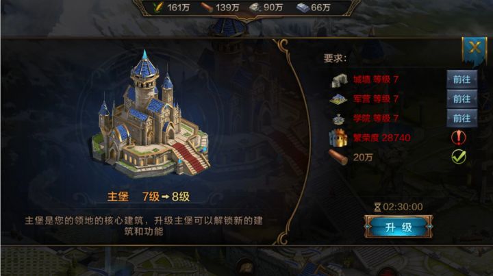 在王朝中:建筑是衡量一个领主强大的重要标准,不过想要把建筑“达标”,可不是一个简单的事情。王朝的建筑分为前置建筑和资源建筑:前置建筑包括主堡、大使馆、学院、医院、仓库、兵营和城墙等;资源建筑包括农田、伐木场、行军帐篷和石矿场等。前置建筑等级达到要求等级,才能建造或者升级该建筑,主堡是所有建筑的必备条件,所有建筑等级不能超过主堡等级。所以主堡的优先级是最大的。升级主堡需要满足前置建筑条件,我们也