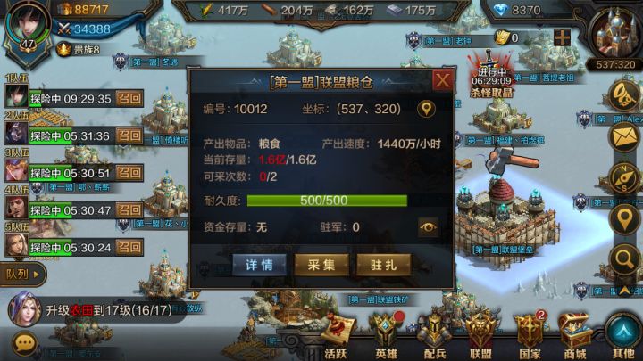 大家好,这次小编给大家带来的是如何成为资源大亨的一点小知识。方便大家更好的进行游戏。首先和大家介绍一下游戏的基础资源,分为粮食、木头、石头和铁。其中粮食和铁是训练士兵要消耗的资源(六级兵之训练士兵不消耗铁!),而木头和石头是建筑升级所需要的资源。(城墙受损修复只需要石头)。接下来小编给大家介绍一下除了自身领地产出资源外的几种获取资源的方法。联盟领地中会有资源建筑,每天都可以采集两次。很轻松就可