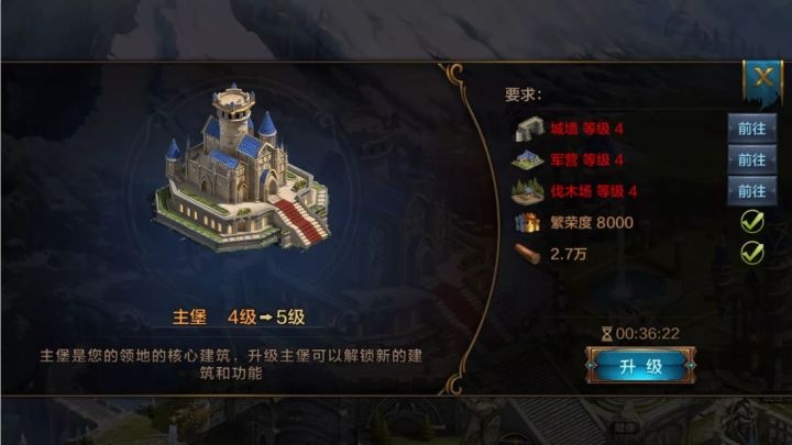 众所周知,一个好的城市离不开繁荣,小编现在就带你们走向“繁荣”。那么繁荣度到底是什么呢?繁荣度是城堡建设程度的体现,城堡内建筑的数量越多,等级越高,繁荣度就会越高。所有的建筑升级均有繁荣度的要求条件,必需达到相应的繁荣度才能升级,如图,小编在17升18堡时由于繁荣度不够,即使其他条件达到也是不能升级的。所以繁荣度对于城市的发展很重要。在这里小编告诉大家一个小方法:平均升级所有建筑,合理的运