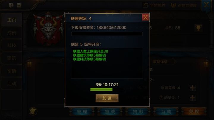 “报告盟主,我们联盟人数又满了、科技等级又卡住了怎么办?在线等,急!”“能怎么办?当然是选择升级联盟等级咯!”在王朝中:盟主可以使用联盟资金升级联盟,联盟等级越高,容纳成员越多;联盟建筑和联盟科技可以升级得越高。在王朝中,联盟的等级很大程度决定了这个联盟是否强大,当然联盟等级可以增加一些小伙伴,最重要的还是联盟的小伙伴是否团结!感谢一路有你!我的兄弟,我的王朝!