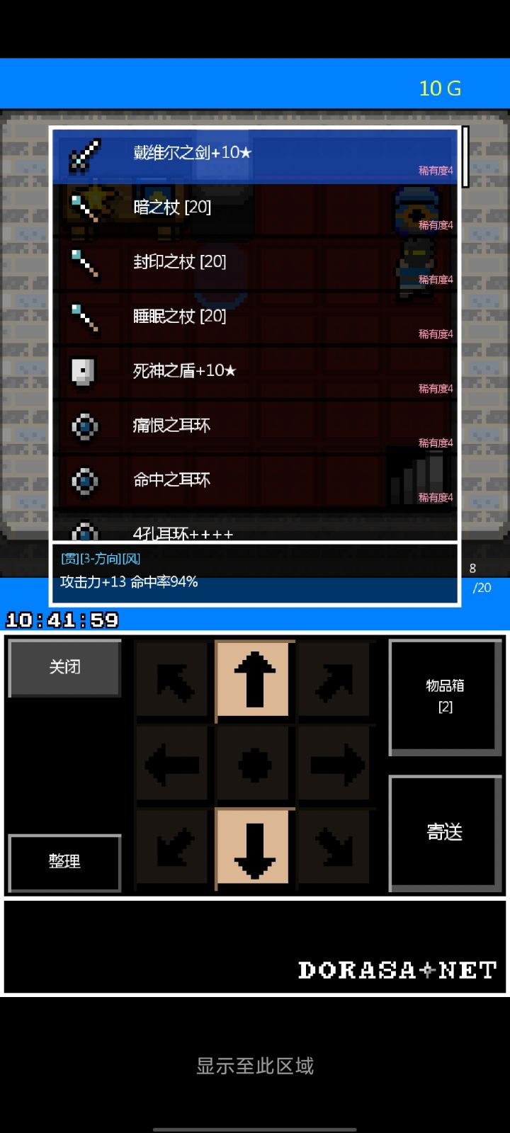#勇者之地牢 我收集了一些稀有度4的物品,如下:死神之盾,防御13,自带[暗]属性,自带三孔,打败死神低概率掉落。戴维尔之剑,攻击13,命中94%,自带[贯]属性,自带三孔,这把剑我是打败恶魔掉落的,不知道是不是专属掉落物。暗之杖,[暗]50%触发即死效果,少女之迷宫最后一层获得。封印之杖,[封印]我也不知道有什么用,有知道的留言一下,坑道之迷宫最后一层获得。睡眠之杖,[睡眠]可以使怪