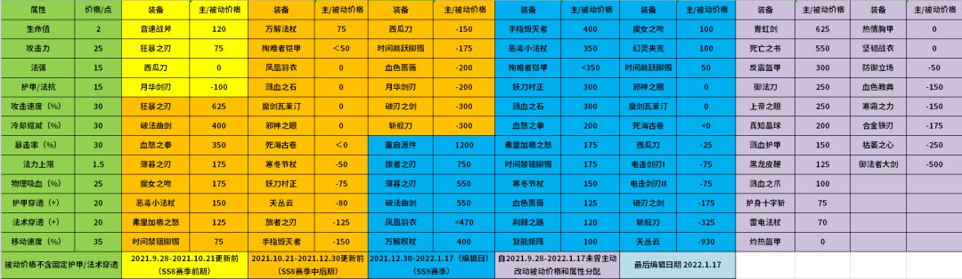 注:1.图文非官方,可能存在错误,有错误以及遗漏请第一时间联系我,我将及时改正。 2.图中绿色数值通过基础装备推定价格,其中固定穿透类因为大多存在唯一被动限制,实际价值可能更高 3.移动速度推断较为模糊,5%移速和8%移速及10%移速严谨来看不能用每%来统计,但本图纳入计算 4.生命恢复及法力回复难以严谨推断,故不纳入计算,存在该属性的用大于小于来表示实际价格出入 5.结合2、3、4点,排除其中影