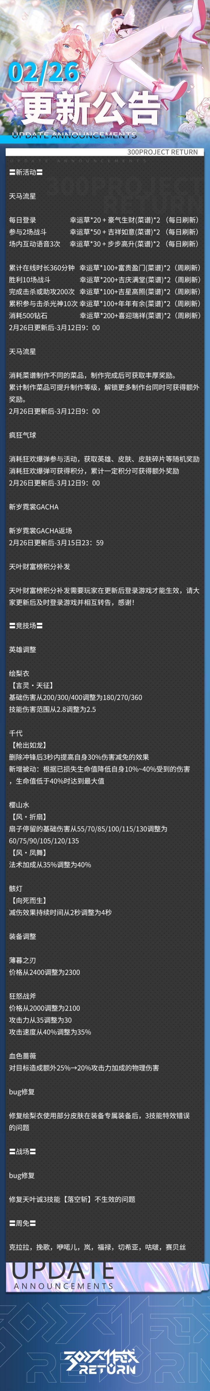 亲爱的天启城冒险者们: 奥莱科技预计于2026年2月26日08:30-11:30,对相关设施进行维护工作,届时天启城入口将关闭,您将无法登录游戏,请提前做好下线准备。 根据工作进度维护可能提前结束或推迟,请冒险者们互相转告! 以下为本次维护更新内容及近期修复/优化内容 #300大作战 #300大作战return