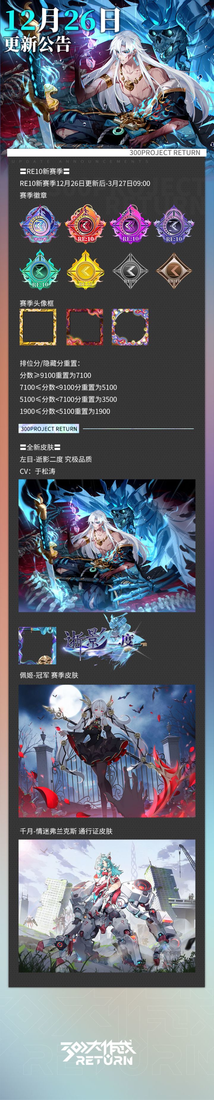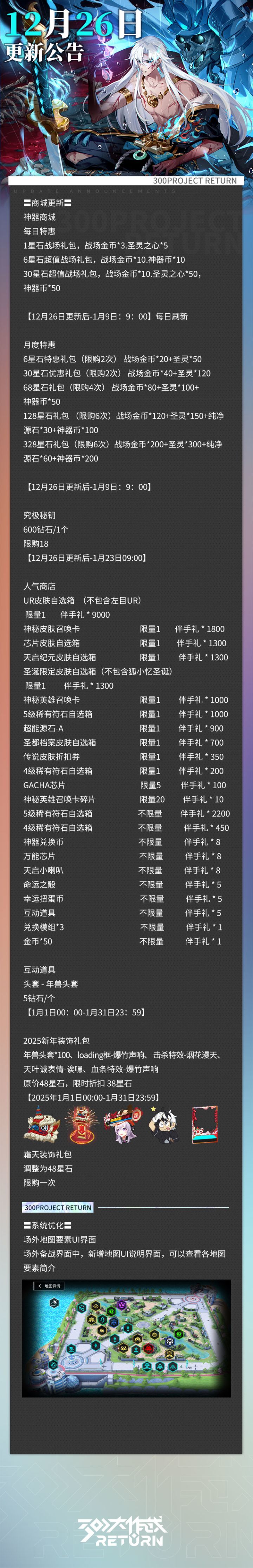 #300大作战 #300大作战return 亲爱的天启城冒险者们: 奥莱科技预计于2024年12月26日08:30-11:30,对相关设施进行维护工作,届时天启城入口将关闭,您将无法登录游戏,请提前做好下线准备。 根据工作进度维护可能提前结束或推迟,请冒险者们互相转告! 以下为本次维护更新内容及近期修复/优化内容。