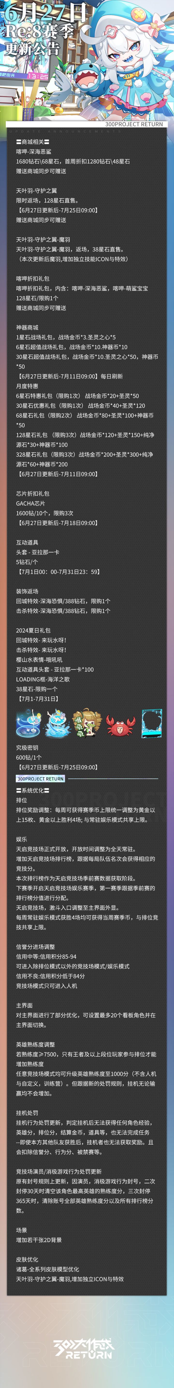 #300大作战 #300大作战return 亲爱的天启城冒险者们: 奥莱科技预计于2024年06月27日08:30-12:30,对相关设施进行维护工作,届时天启城入口将关闭,您将无法登录游戏,请提前做好下线准备。 根据工作进度维护可能提前结束或推迟,请冒险者们互相转告!以下为本次维护更新内容及近期修复/优化内容。