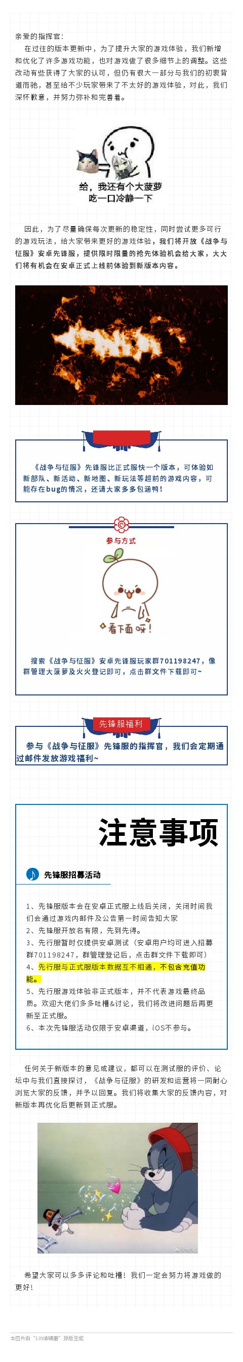各位指挥官:为了让大家更好的进行游戏体验,《战争与征服》项目组决定在7月15日18点00分进行版本更新,届时所有指挥官需要更新V1.1.1版本客户端才可进入游戏。届时请大家在wifi网络环境下通过appstore进行游戏更新。更新后我们将会全服发放更新补偿,补偿将会通过邮件形式发放到指挥官邮箱:金砖*100后续我们会不断的继续优化产品,给予大家一个更好的游戏体验,如您有任何问题,请关于公众号