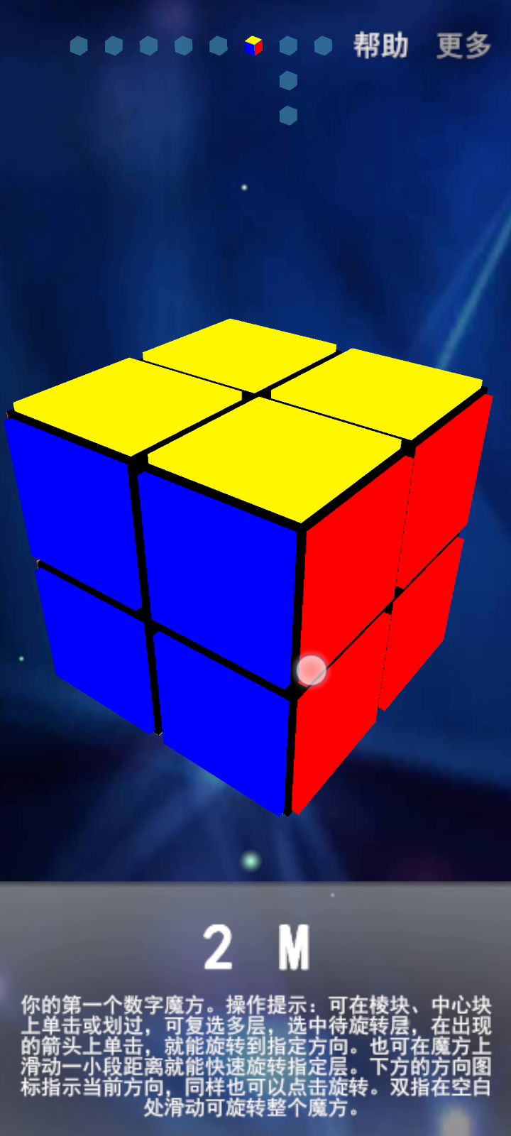 本游戏的正阶有正六面体,2M,3M空心,4M和5M正六面体其实就是普通三阶就不用我多说了吧可以用LBL,CFOP及桥式等派生方法(本人萌新只背了几条CFOP)2M二阶可以用三阶复原角块的方法可以用层先,面先,EG等(我个人用的面先)3M空心和普通三阶大同小异最后的P特(两棱换)可以做这条公式解决M2 U M' U' M2再重做一下OLL和PLL(这条公式其