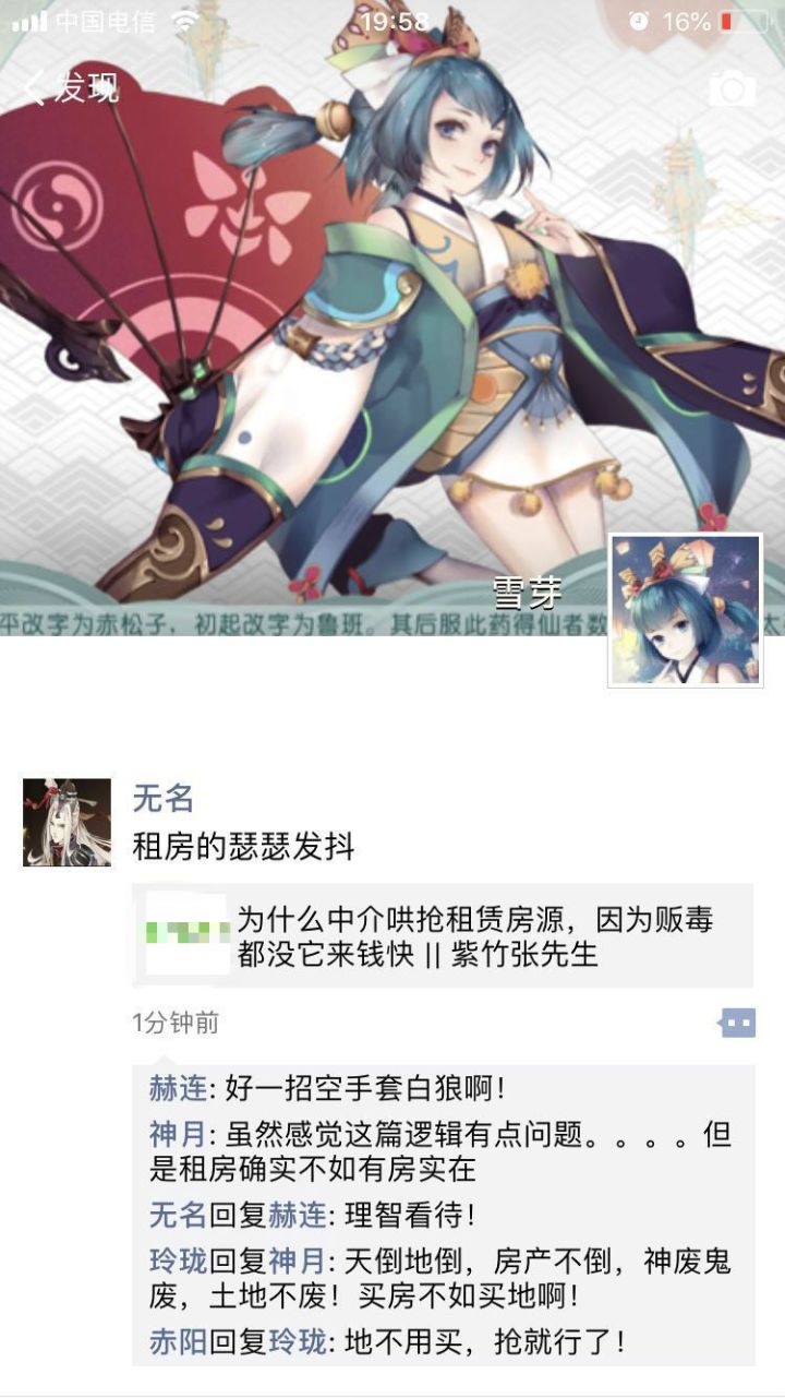 “清早起来打开窗,生活美美哒,打开手机朋友圈,心情……“这么可怕?雪芽开始感到严重不安,万一哪天,中介垮了,租房市场崩了,自己无处可去了咋办?还是得早做打算,租房,终归是不如买房的。看看人家宇文泰,三年前在洛阳买了一套房,现在已经躺在家过着包租公的生活了。可是,雪芽看了一眼洛阳的房价……算了,买房是不可能买房的,这辈子都不可能买房的。抢块地倒是可以考虑考虑。于是六人拉了小群,一经商议,