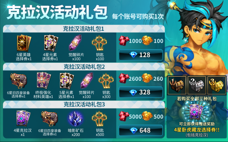 商城礼包新增活动英雄礼包3种,每种礼包每位骑士可购买1次。礼包全部购买将额外赠送4星卧虎藏龙选择券*1(包括克拉汉)礼包内容: