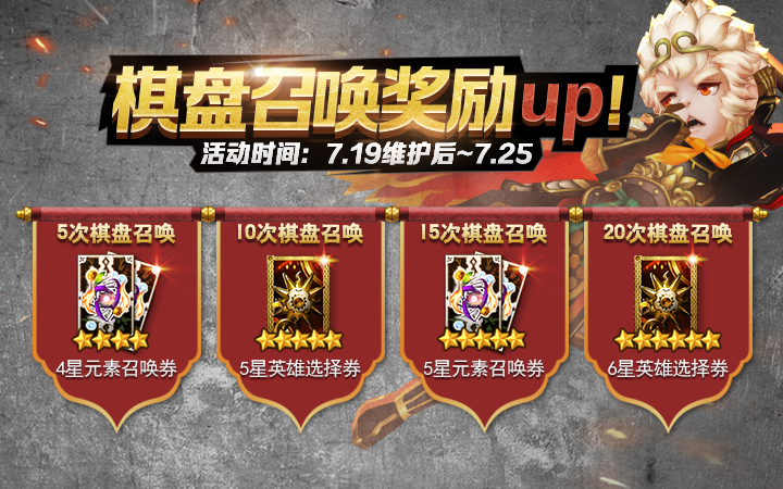为了让大家可以获得更好的元素和英雄,本次更新维护后,棋盘召唤奖励up!通过棋盘召唤英雄,达到一定次数即可获得对应奖励。最高可以获得6星英雄选择券!活动时间:7月19日维护后 至 7月25日条件&奖励:进行5次棋盘召唤:4星元素召唤券*1进行10次棋盘召唤:5星英雄选择券*1进行15次棋盘召唤:5星元素召唤券*1进行20次棋盘召唤:6星英雄选择券*1