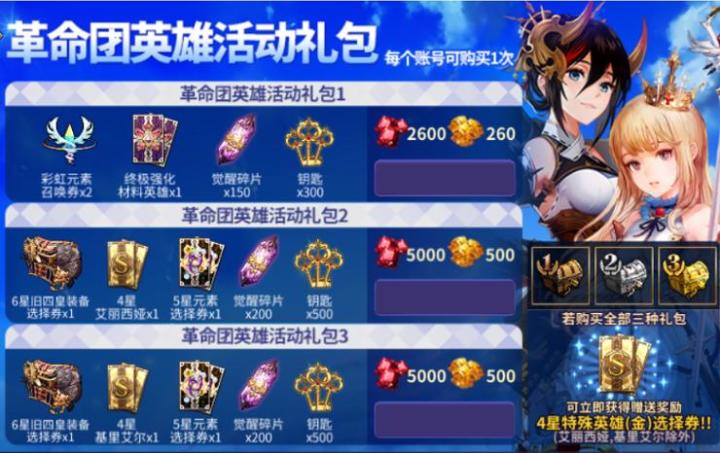 商城礼包新增革命团英雄礼包,每种礼包每个账号可购买1次。-礼包全部购买将额外赠送4星特殊英雄(金)选择券(艾丽西娅、基里艾尔除外)礼包内容: