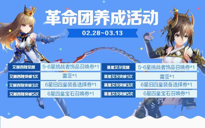 革命团养成活动艾丽西娅女王将率领革命军为泰拉王国而战,革命军虽然得到不少骑士的呼拥,但身为领军人,艾丽西娅身上的重担如山,她对自身实力提升的渴望也从未停歇。活动期间内,觉醒并养成艾丽西娅和基里艾尔可以获得6星四皇宝石召唤券等奖励。活动时间:2月28日更新后 ~ 3月13日条件&奖励:艾丽西娅觉醒:5~6星挑战者饰品召唤券*1艾丽西娅突破1次:雷亚*1艾丽西娅突破3次:6星旧四皇装备选
