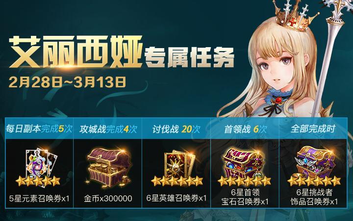 觉醒艾丽西娅与基里艾尔登场,革命团迎来崛起,但革命尚未成功,骑士仍需努力。挑战也同时意味着蜕变,完成所有任务可以领取6星挑战者饰品召唤券。活动时间:2月28日更新后 ~ 3月13日条件&奖励:每日副本完成5次:5星元素召唤券*1攻城战完成4次:金币*300000讨伐战20次:6星英雄召唤券*1首领战6次:6星首领宝石召唤券*1全部完成时:6星挑战者饰品召唤券*1
