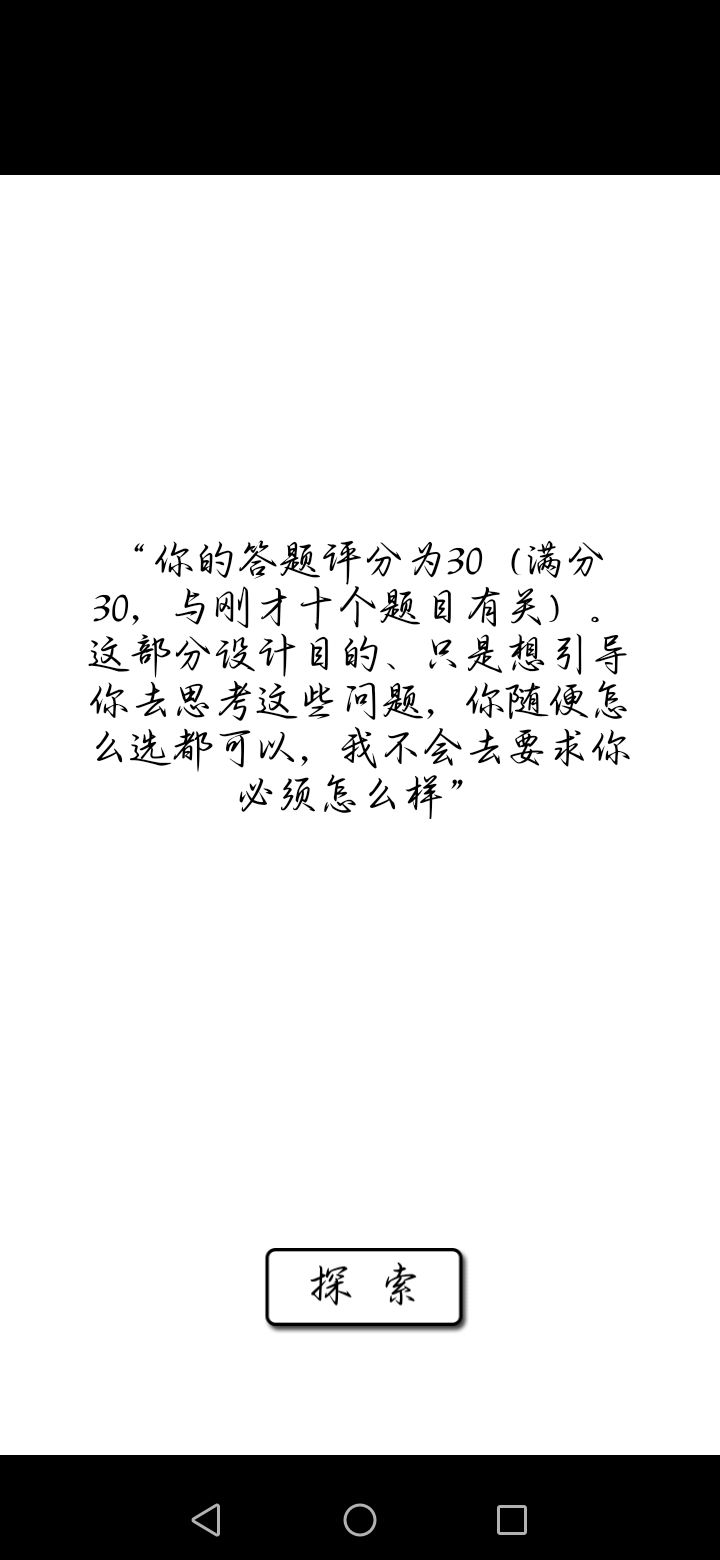 第一次玩,还是小时候电脑的4399上面,当时觉得这个故事特别长,一直没有玩完过,昨天突然想到就下载了,没想到几个小时就通关了,最后能打过boss也是我没想到的,选的是新手模式,游玩过程也有一些个人的坚持,比如不抽烟,扶老奶奶,卖红薯,也有一些自己的愤怒、同情、和孤独,连背景音乐都没有的一款游戏,用简短的剧情塑造了立体的人物形象,这份安静也给了我很多思考的空间,总而言之,是一款很优秀的文字作品