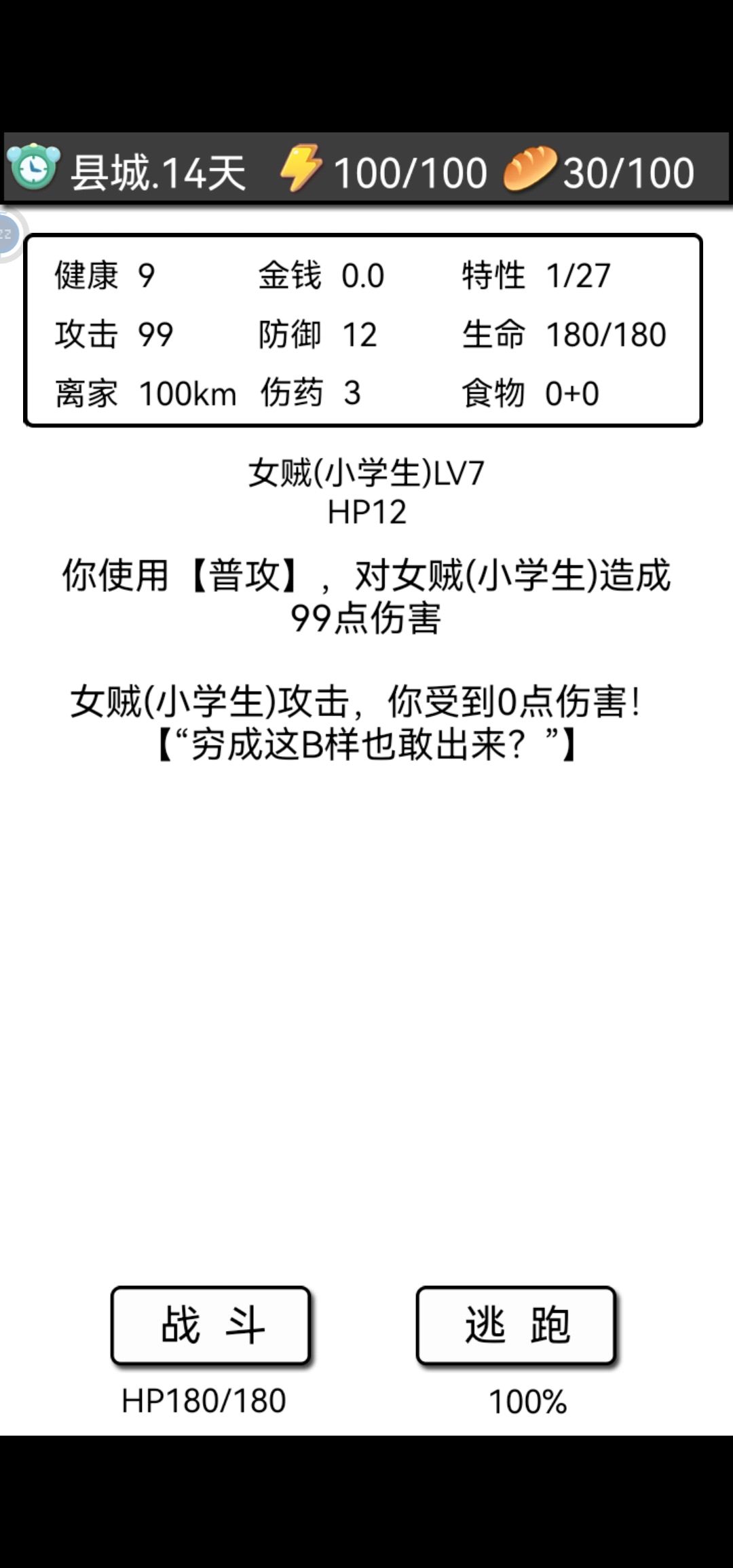 修罗模式,开局依旧是升帐篷遇敌人逃跑,不用想着去打任何一个,你逃跑熟练度越高,成功率也就越高,后面刷的也越轻松, 死了推荐减攻防,我选的是减精力不过感觉都无所谓后面这点不算什么。 城中村刷段时间就可以去市中心了,我是直接在市中心刷的,开始烟有点不够,城中村得的啤酒续了之后就能循环了。不过推荐前面在郊外刷因为有果子不用续食物。 老奶奶最好不要扶没什么用,还有可能坑钱,但是高于一百钱好像就不会摸你钱了