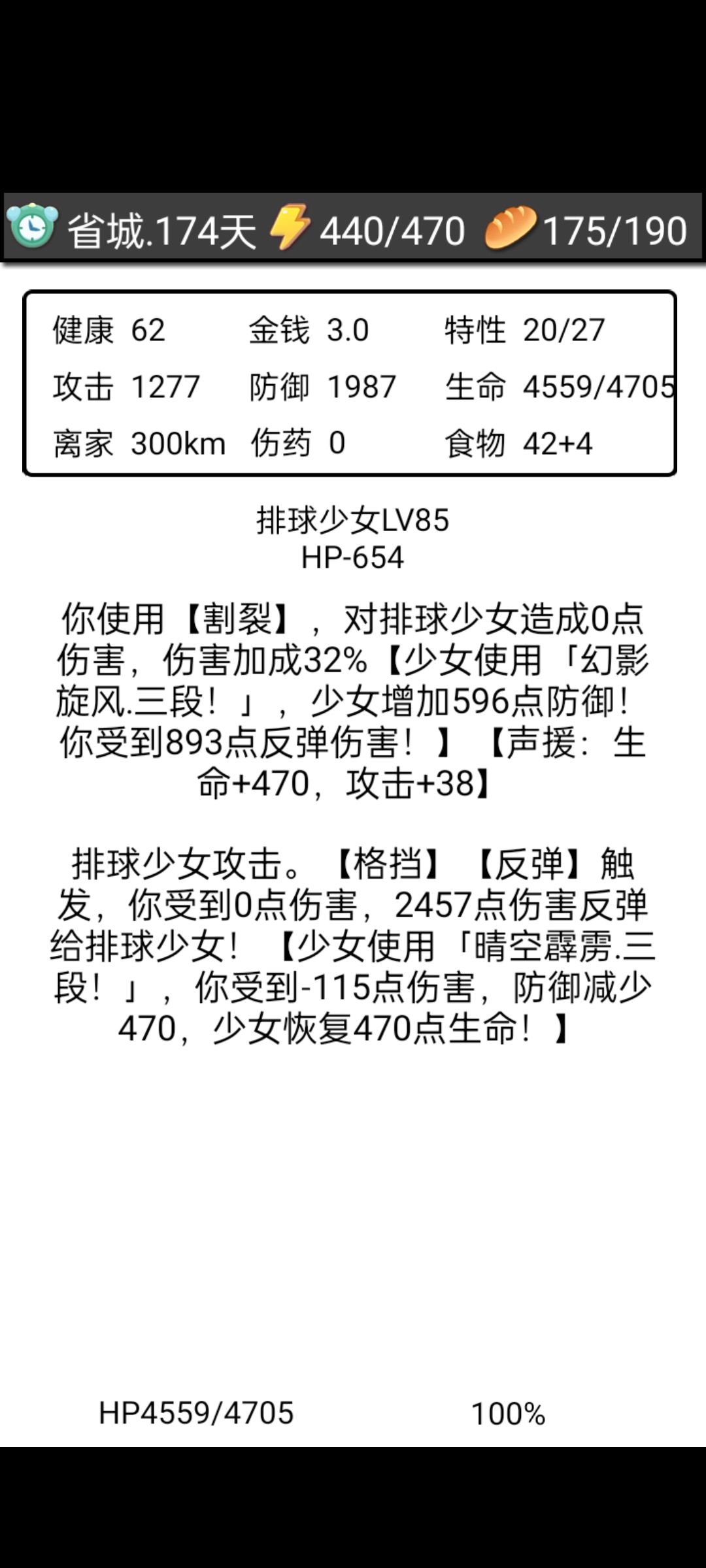 说一下修罗模式打法 前期主升帐篷,除了小蚊外其他全部不打,练逃跑率,吃15个伤药后就不吃了,进入100km后用钱升两级皮衣就可以打蚊子了,多余钱全升精力,事件可以全部不打,属性高量力而行,33天后存钱买黑刀,之后直接前进。 山脉里只能打猴子和野猪,其他打不赢,一级红夹克两级黑刀后一直前进到省城,黑曜石靠探索拿。晓月先不认识,290km时通缉犯难打,而且进省城后晓月她爸也难打,很拖节奏。 进入省城后打阿宾,等晓月,将存的伤药全喂晓月,有240点好感就能打除阿龙以外的怪了。 一百多天开市中心后直接去,只打排球少女,遇到其他怪练的逃跑技巧基本都有90的逃跑率,一直吸烟去大楼除烟瘾就能做到永动机了。 后面就随便乱玩都行了